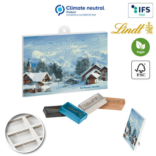 Kalender med bord- og vægophæng i horisontalt format, med stabil indsats, lavet af 100 % genanvendeligt papir, 24 låger, fyldt med Lindt Naps i 4 farver, blandet. Mælkechokolade, kakao: mindst 30 %. Sukkerafgiften er på 25,97 kr.- Pris pr stk. indeholder fragt og sukkerafgift. Alle priser er gældende ved trykklar fil