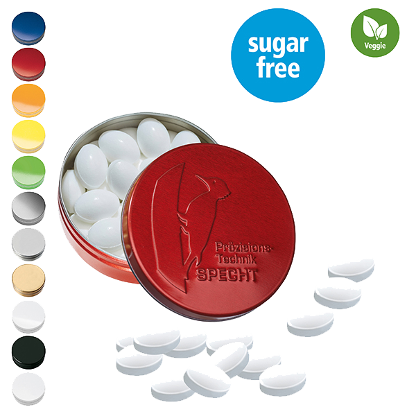 Dåse lavet af 99 % genbrugelig blik i 11 forskellige farver og 10 forskellige fyld, genfyldelig, lukket med afrivningstape. Sukkerafgiften er på 25,97 kr.- Pris pr stk. indeholder fragt og sukkerafgift. Alle priser er gældende ved trykklar fil