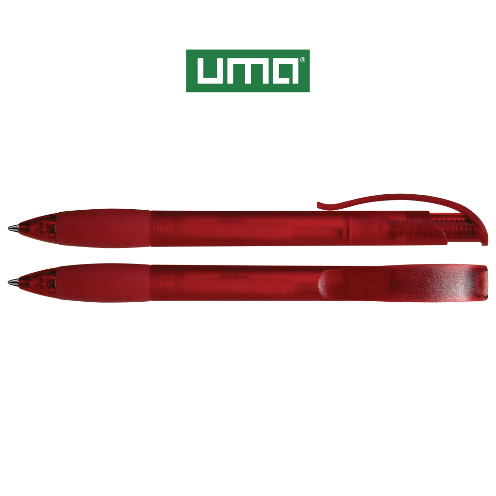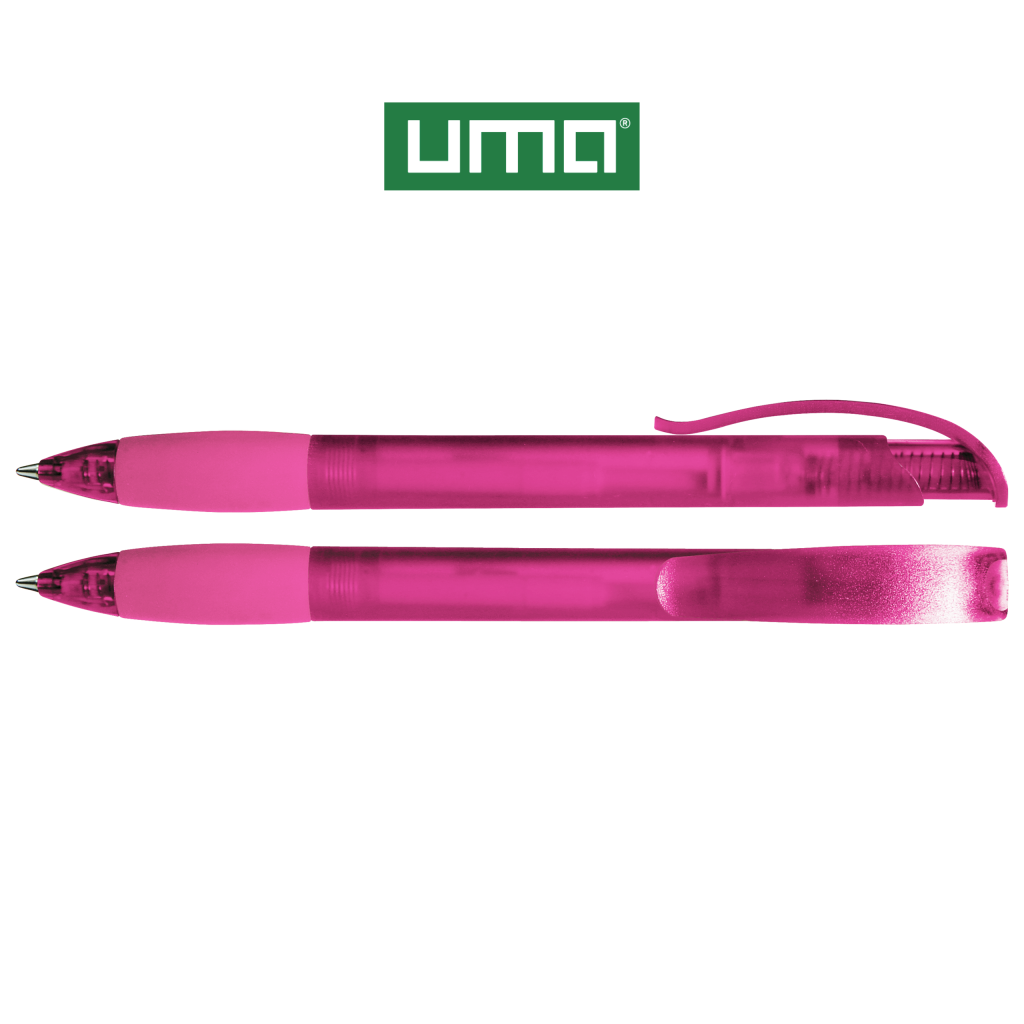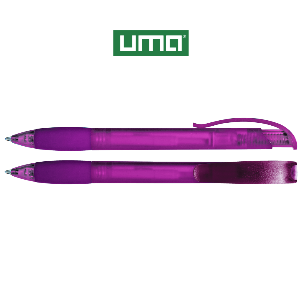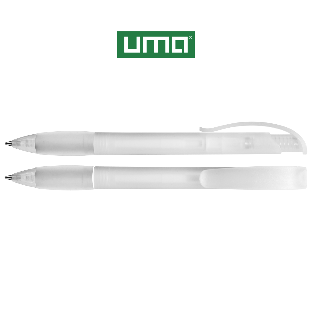 Retractable ballpoint pen with transparent frosted housing, rubber grip zone and clip button with plug.