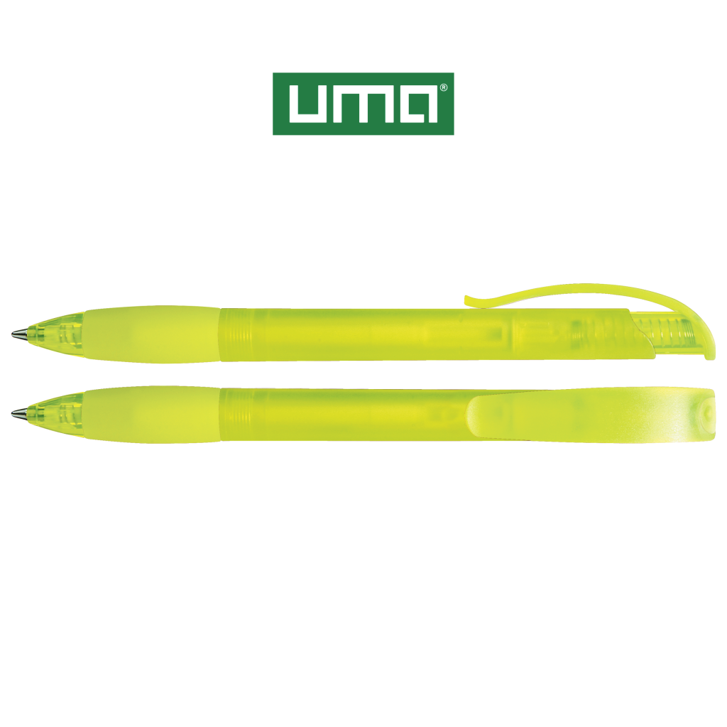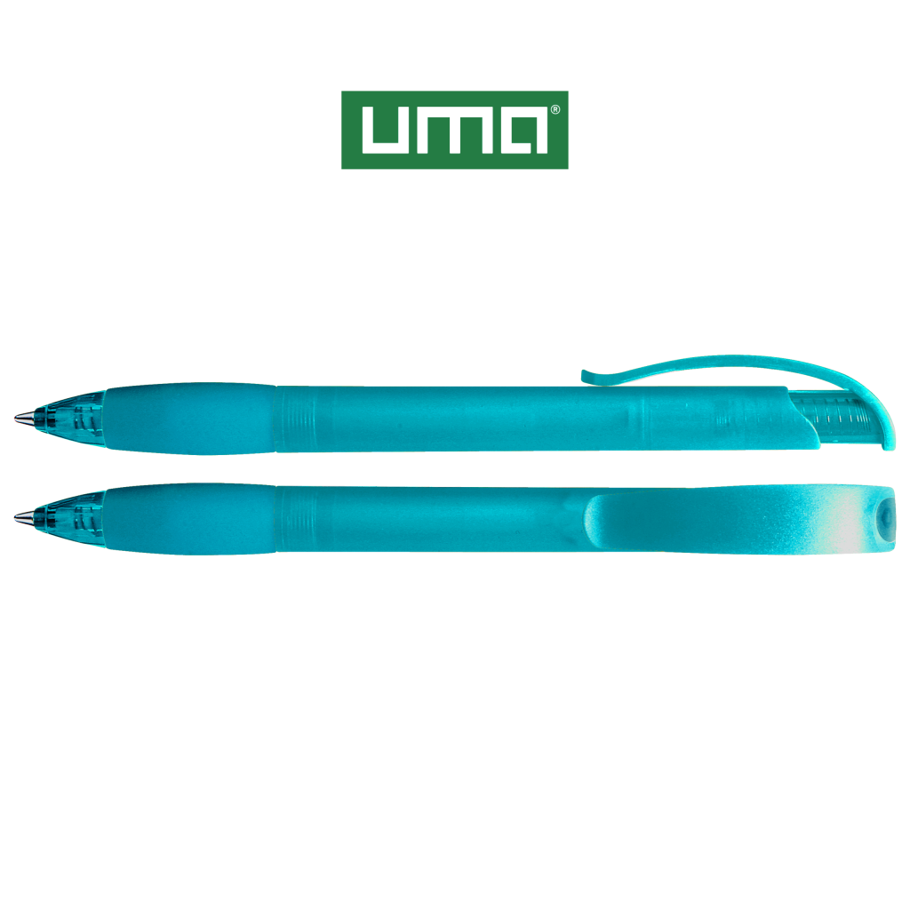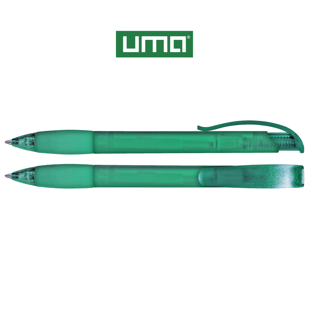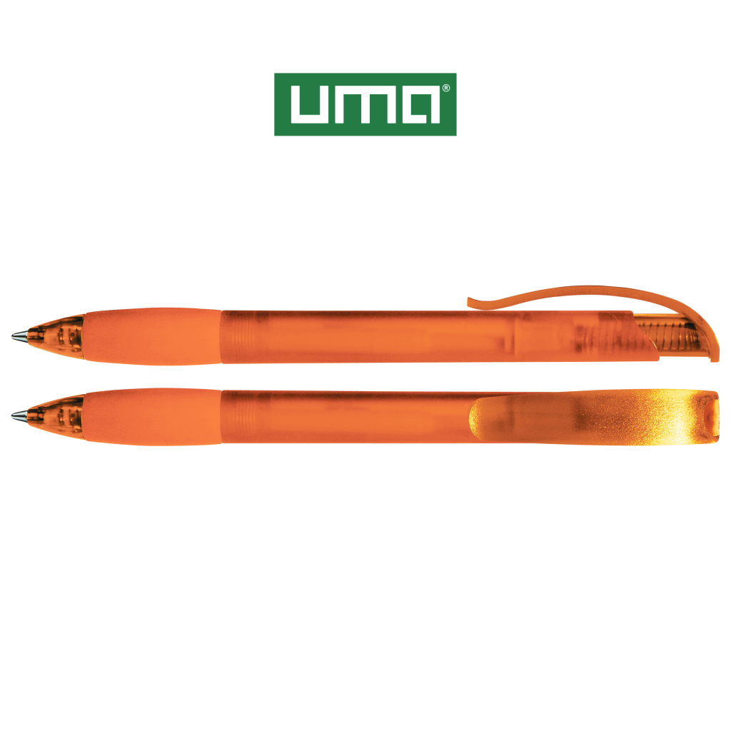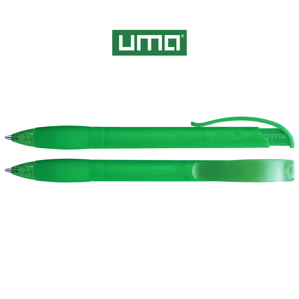 Retractable ballpoint pen with transparent frosted housing, rubber grip zone and clip button with plug.