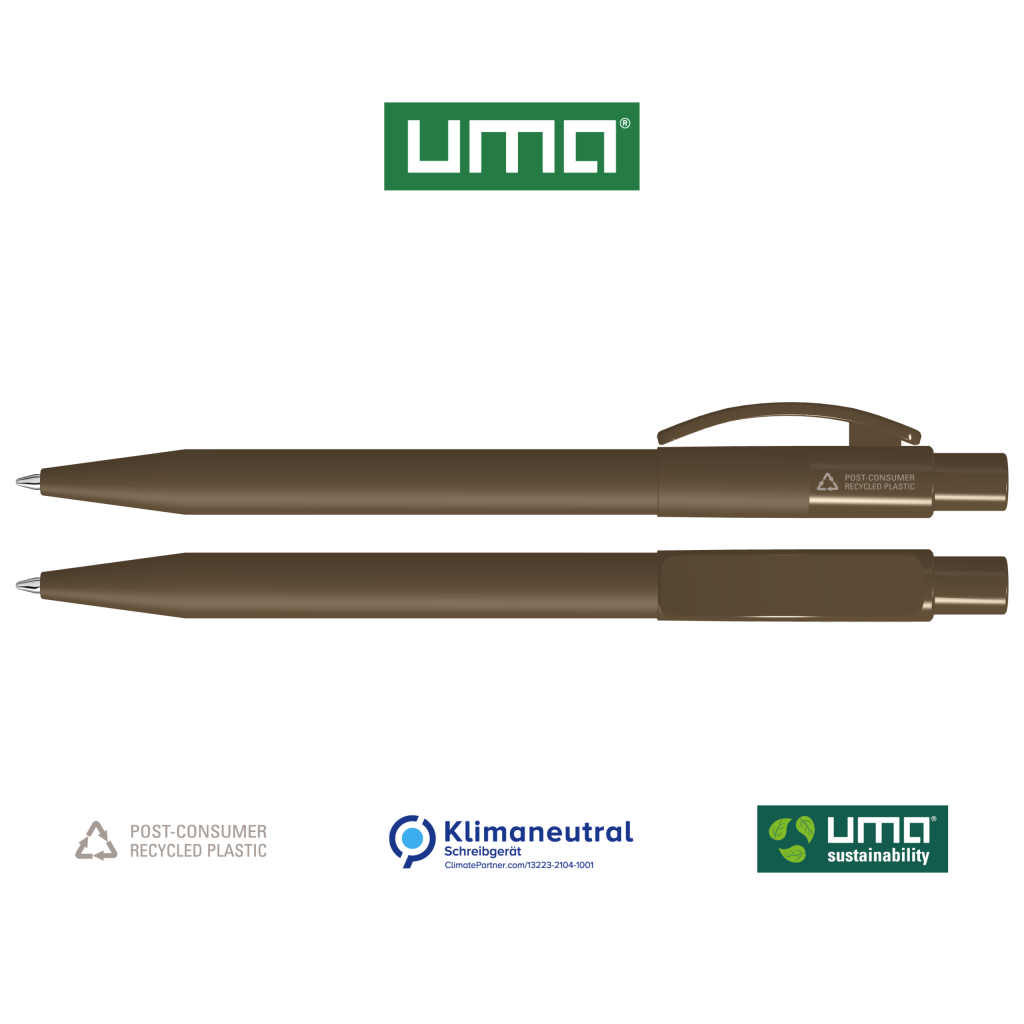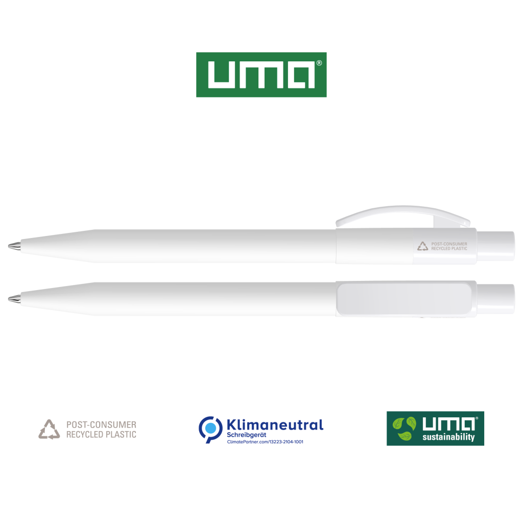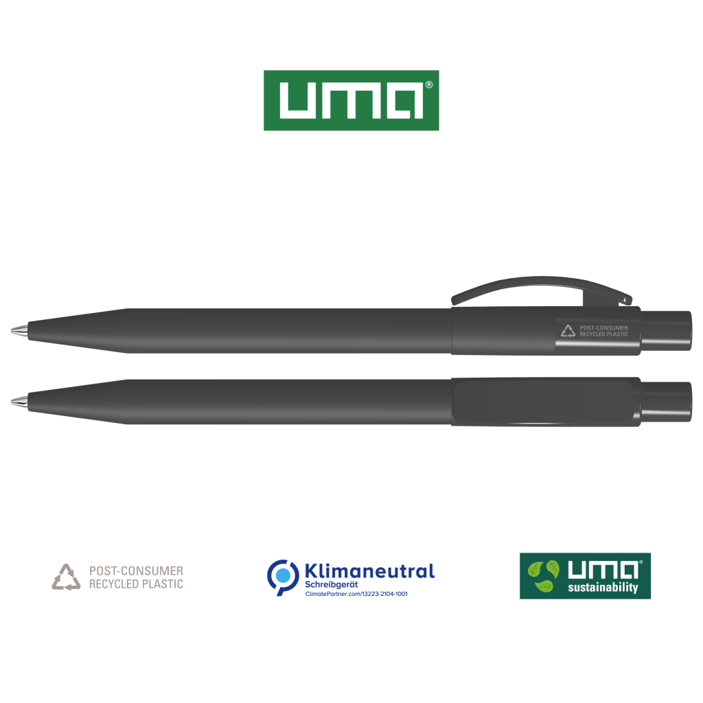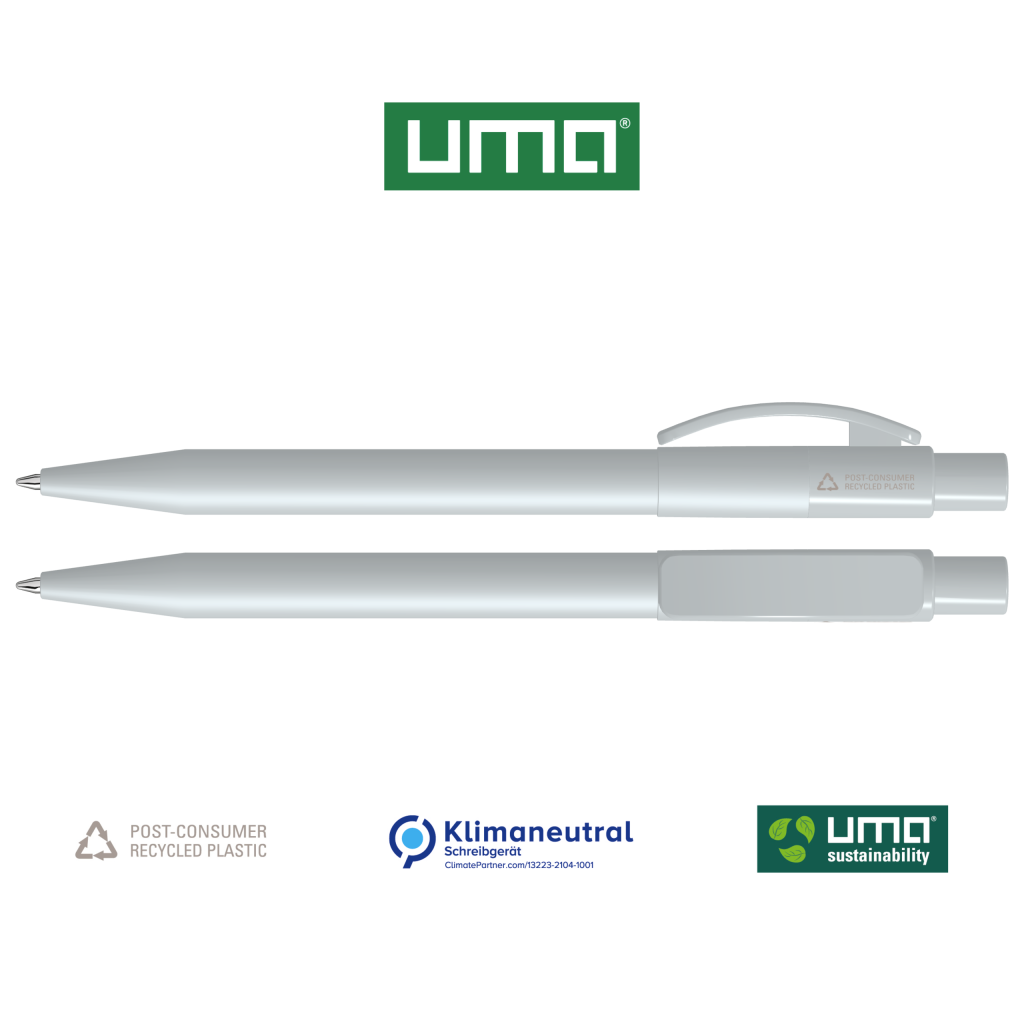 Retractable ballpoint pen with matt plastic housing made from 100% recycled post-consumer plastic, opaque glossy curved clip and push-button. The model is labelled with the recycling mark. Push-buttons available in various opaque glossy colours (standard ABS). Thanks to the European and ClimatePartner-certified production, the uma PIXEL RECY makes an additional sustainable contribution to the protection of the environment. Due to the special nature of the material (post-consumer recycled plastic)production-related variations are possible.