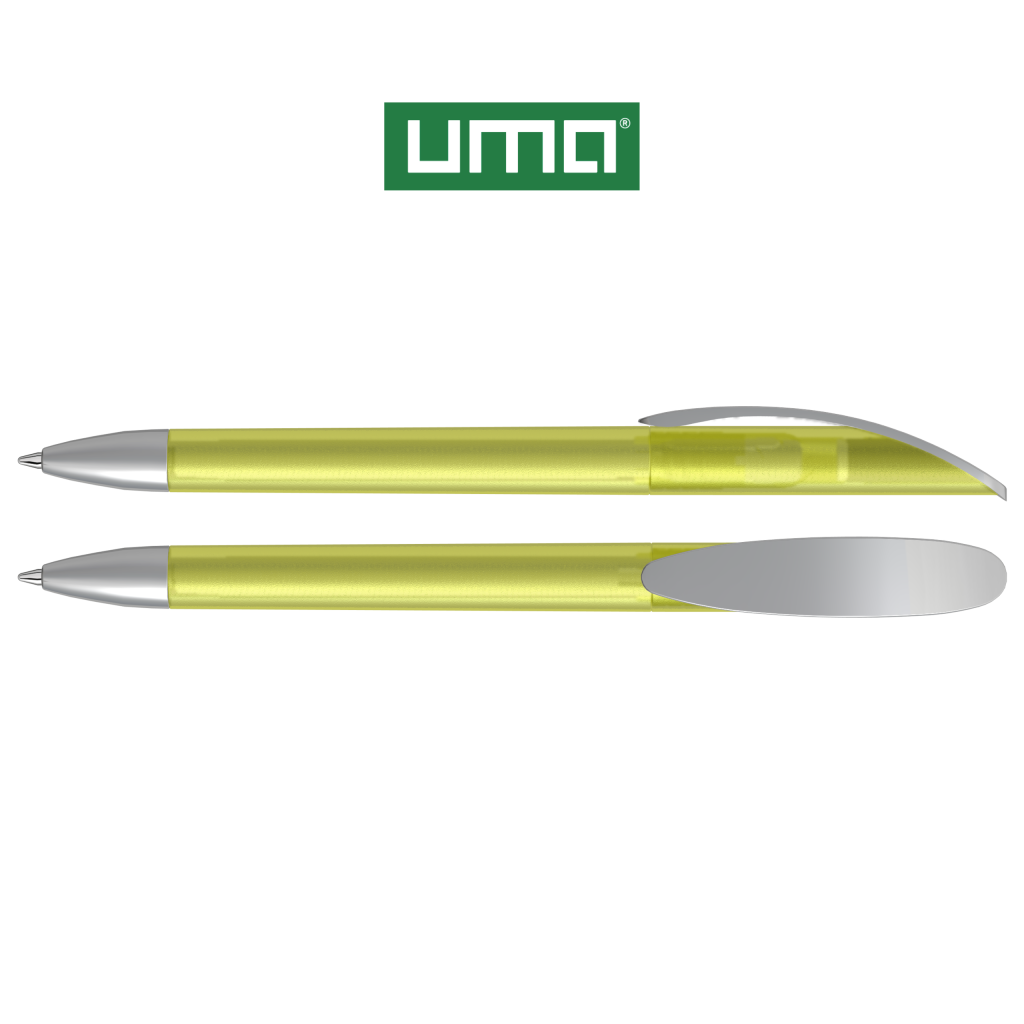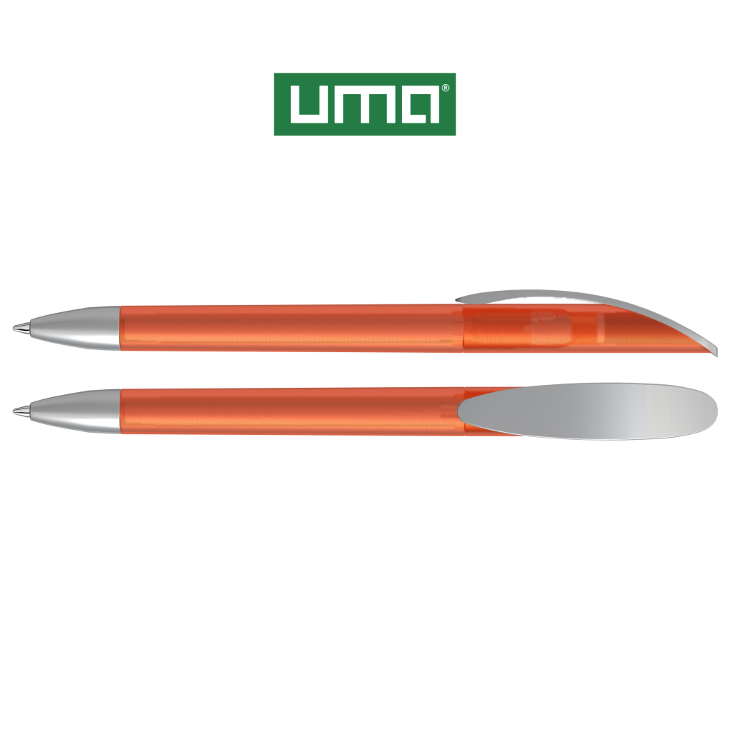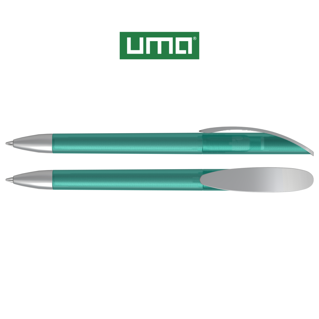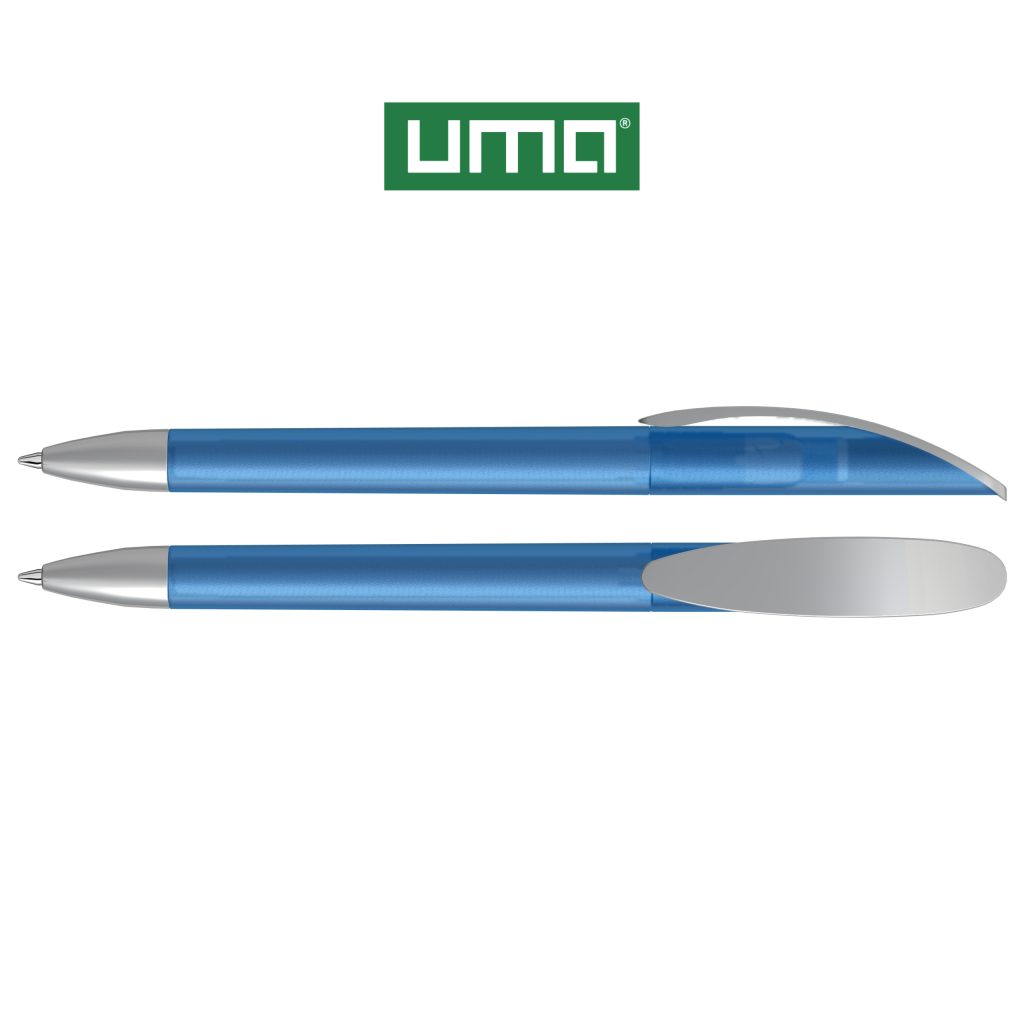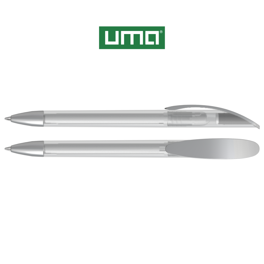 Twist ballpoint pen with transparent frosted or opaque matt housing, curved clip silver matt and heavy metal tip matt chromed.