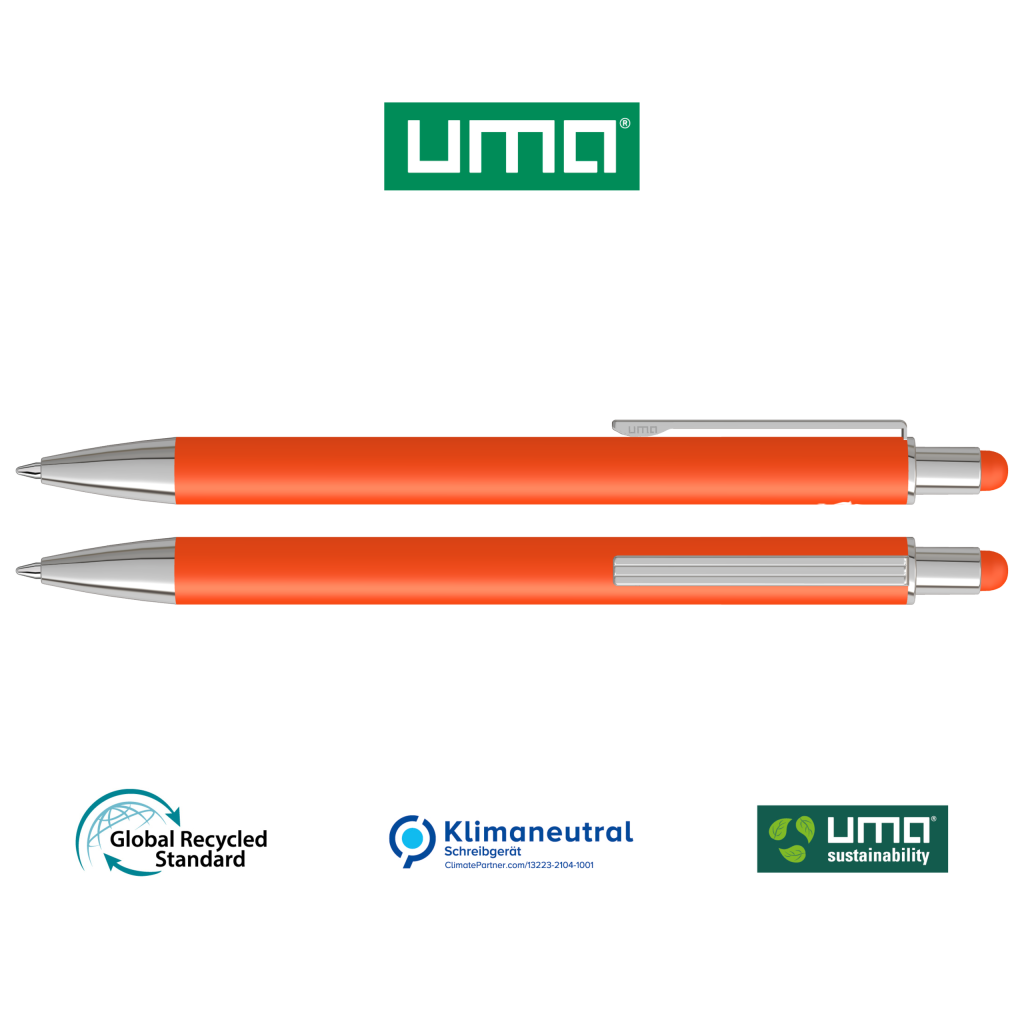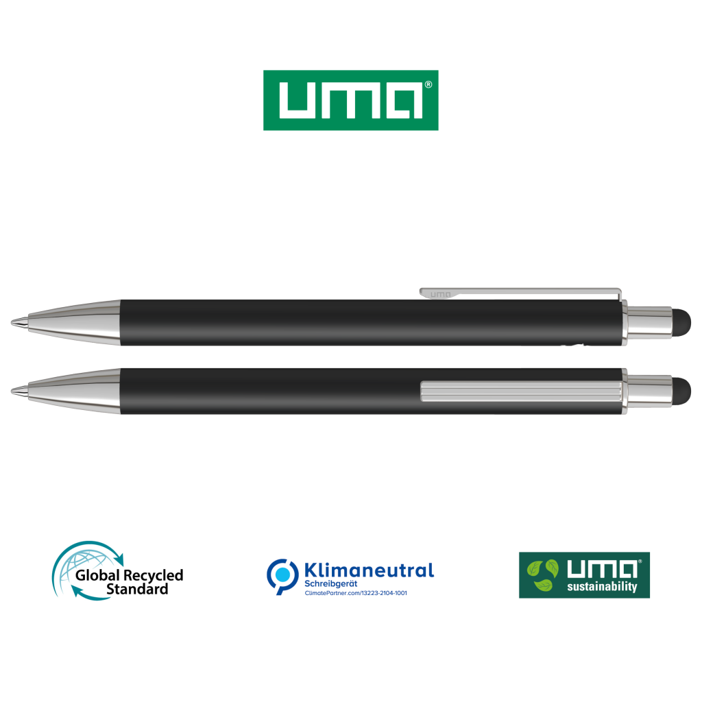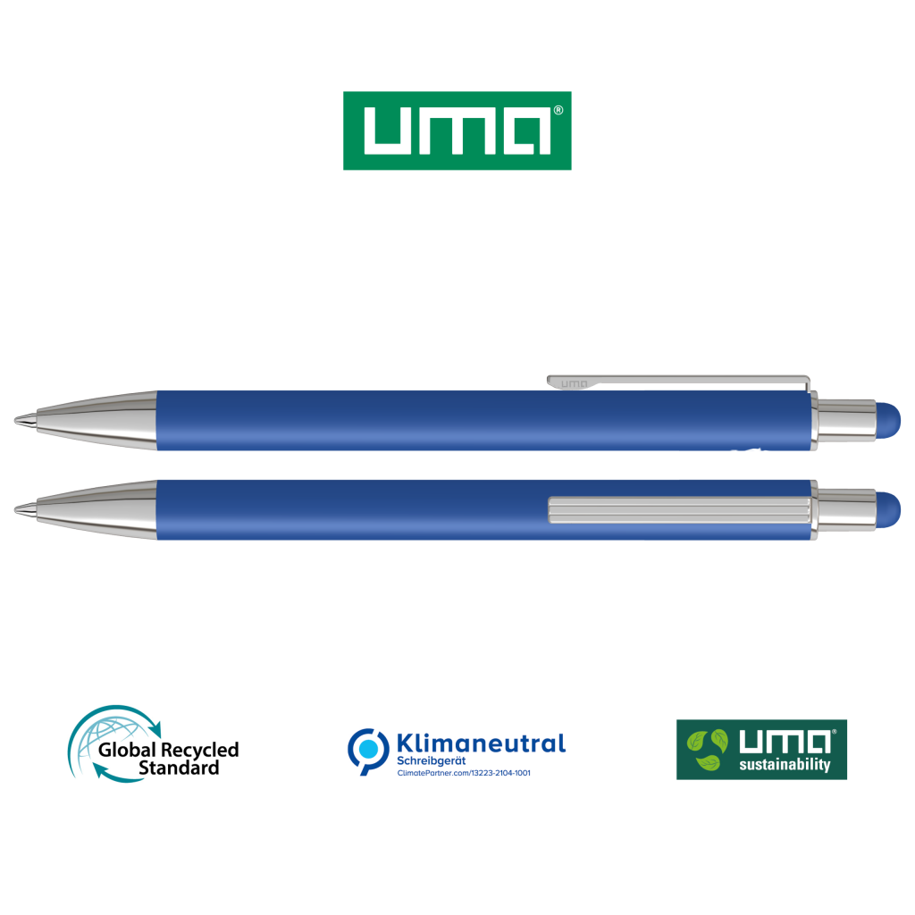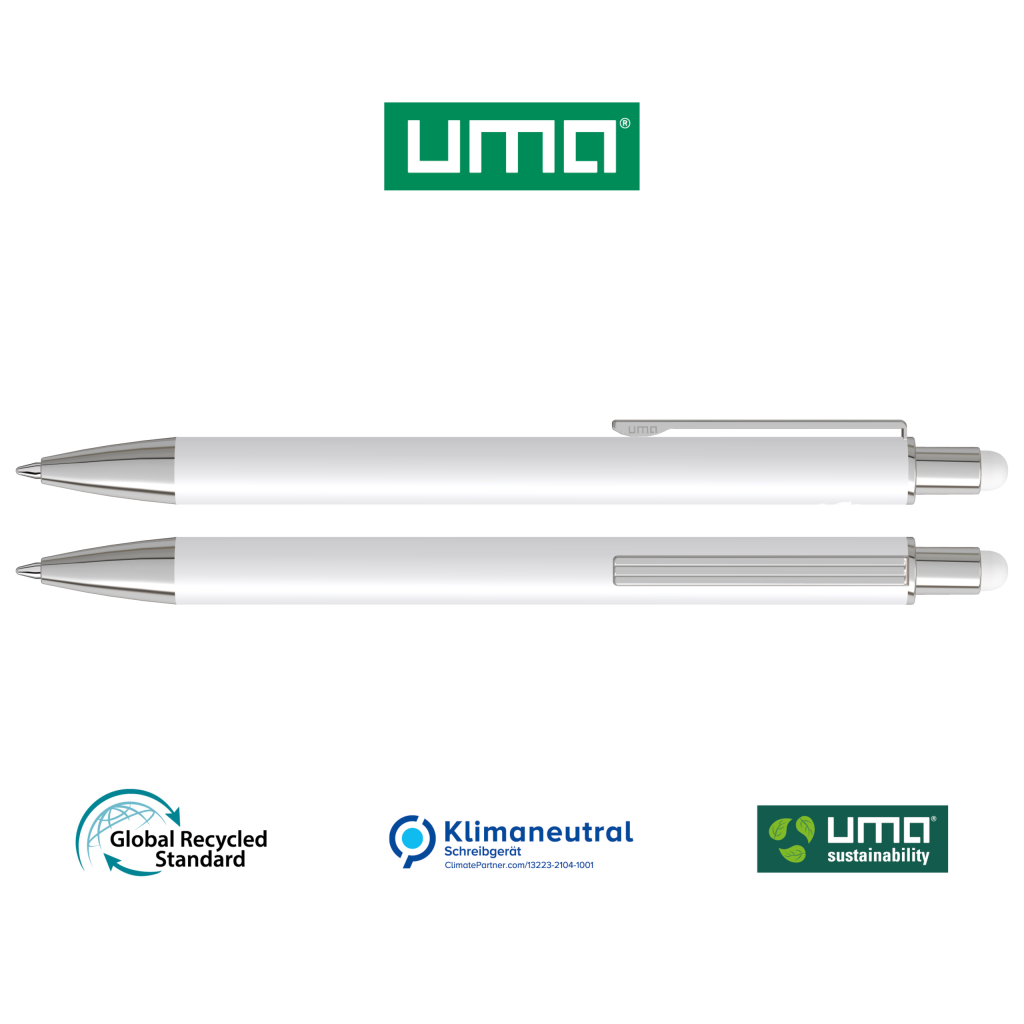 Metal retractable ballpoint pen with matt finish made from recycled aluminium. Metal clip with recessed grooves, metal tip in glossy silver and push-button with integrated touch screen control.