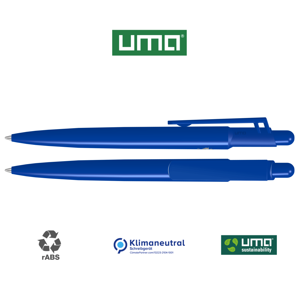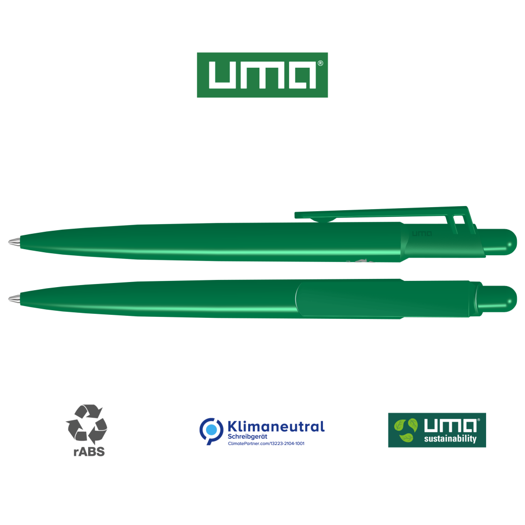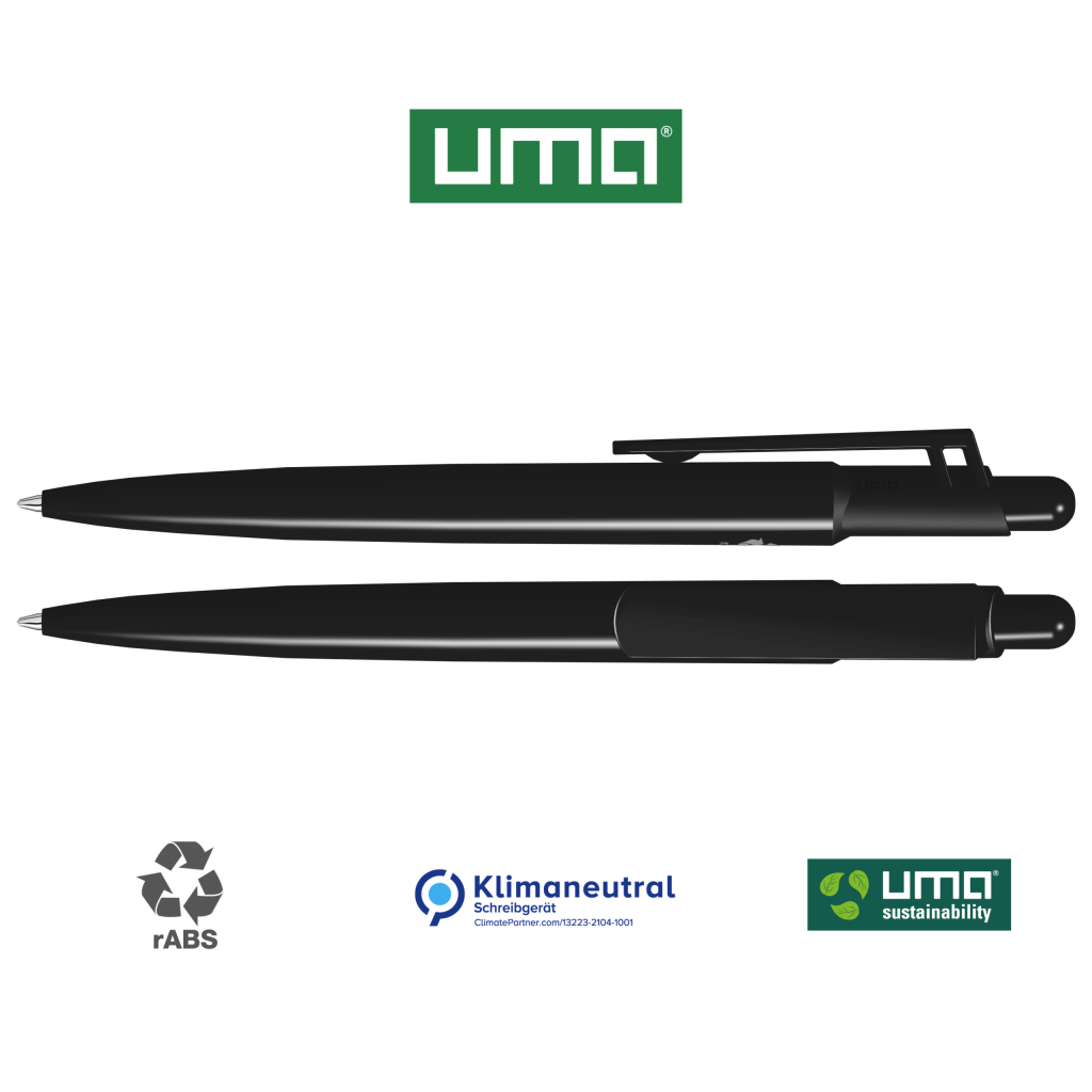 Retractable ballpoint pen with opaque glossy body and large clip made from 100% recycled plastic. The model is labelled with the recycling mark. Thanks to the ClimatePartner-certified production, the uma VITAN RECY makes an additional sustainable contribution to the protection of the environment. Due to the special nature of the material (ABS recycled plastic) production-related variations are possible.