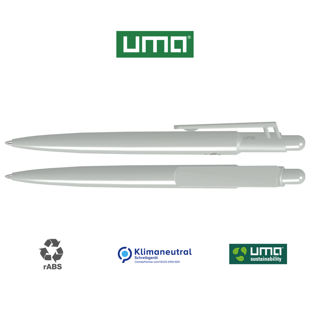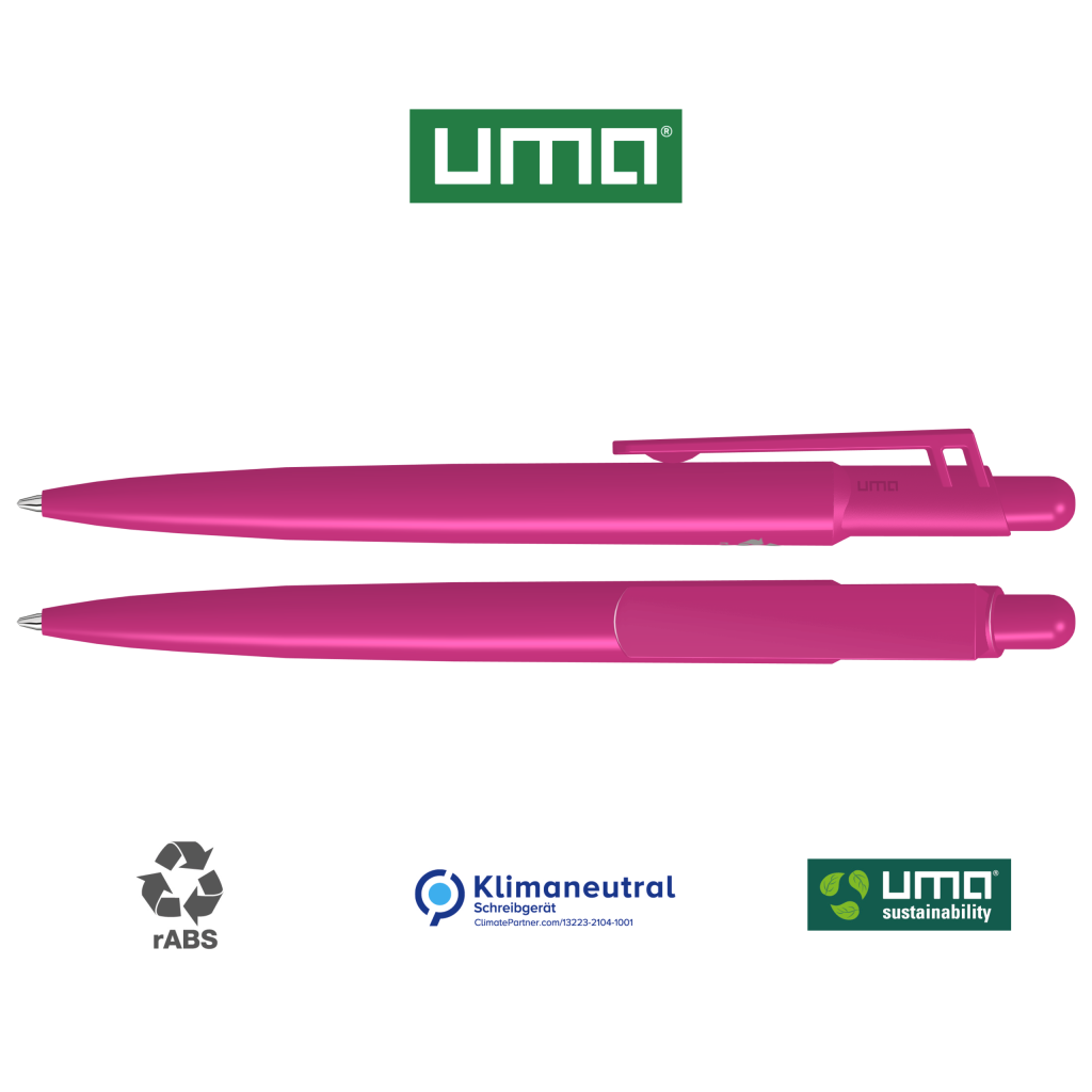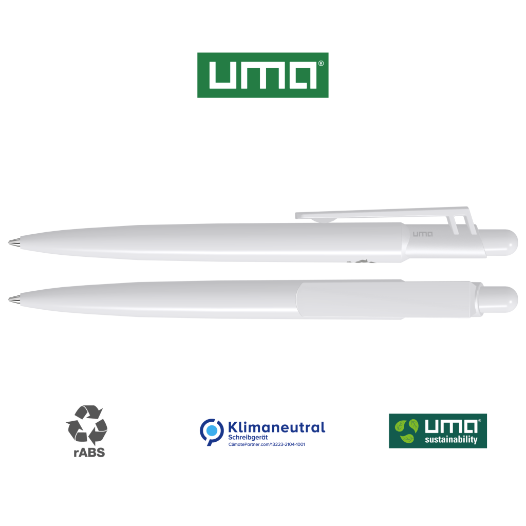 Retractable ballpoint pen with opaque glossy body and large clip made from 100% recycled plastic. The model is labelled with the recycling mark. Thanks to the ClimatePartner-certified production, the uma VITAN RECY makes an additional sustainable contribution to the protection of the environment. Due to the special nature of the material (ABS recycled plastic) production-related variations are possible.