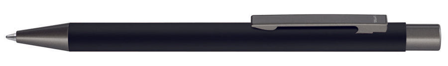 Metal retractable ballpoint pen with softtouch housing made of recycled metal. Metal clip, metal tip and push-button GUN metallic. The model is labelled with the recycling mark. Ink color: Blue