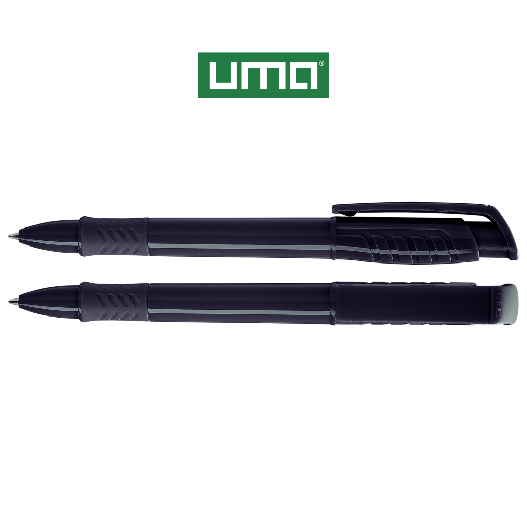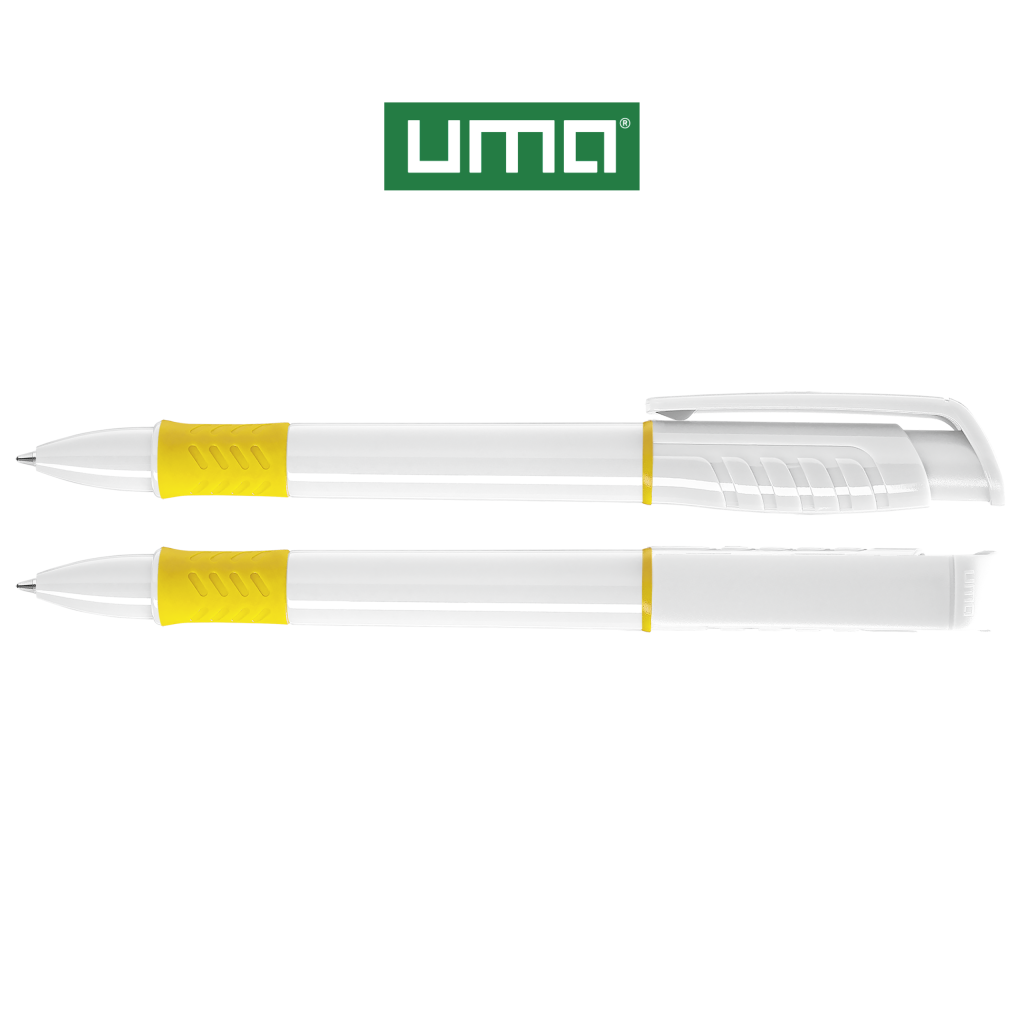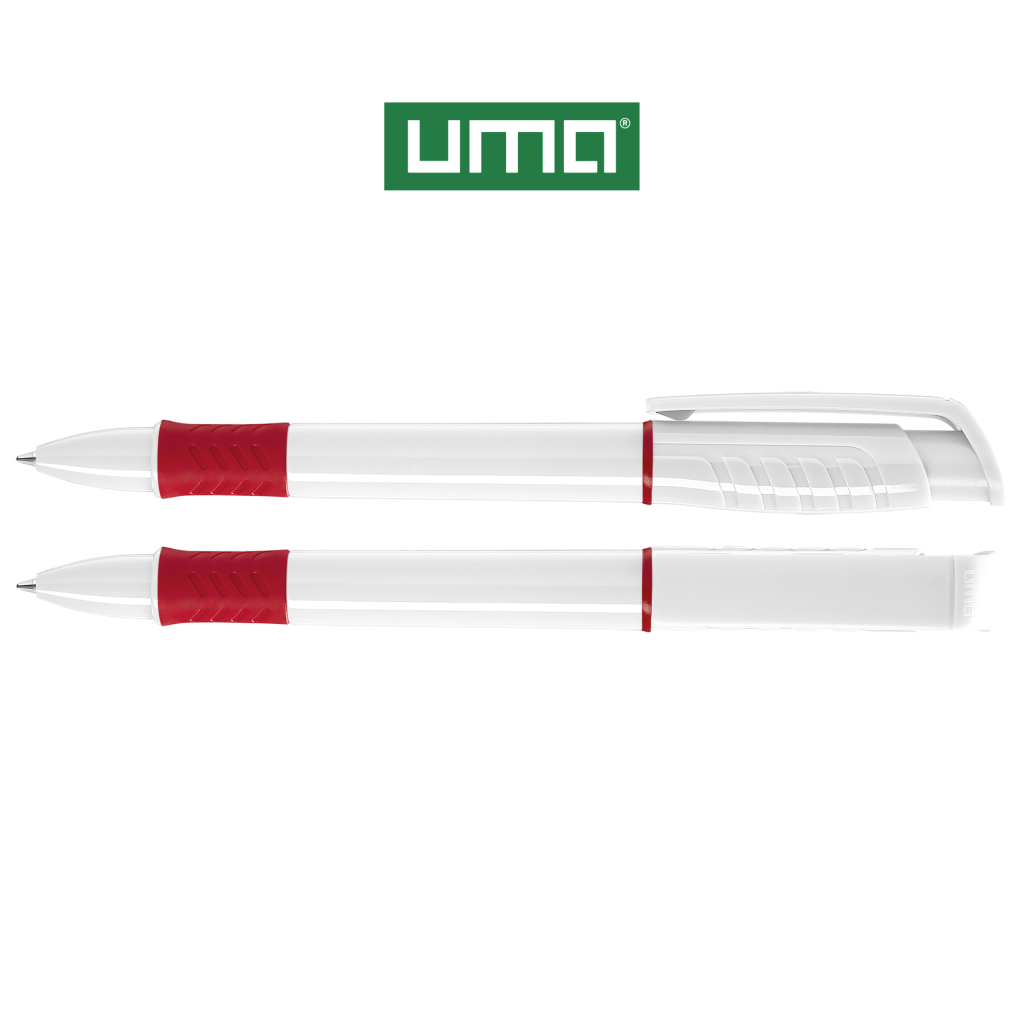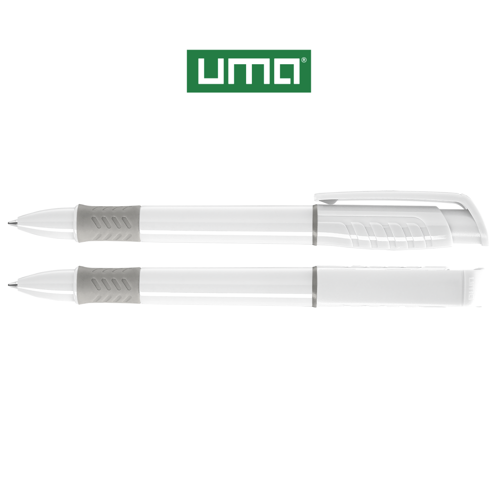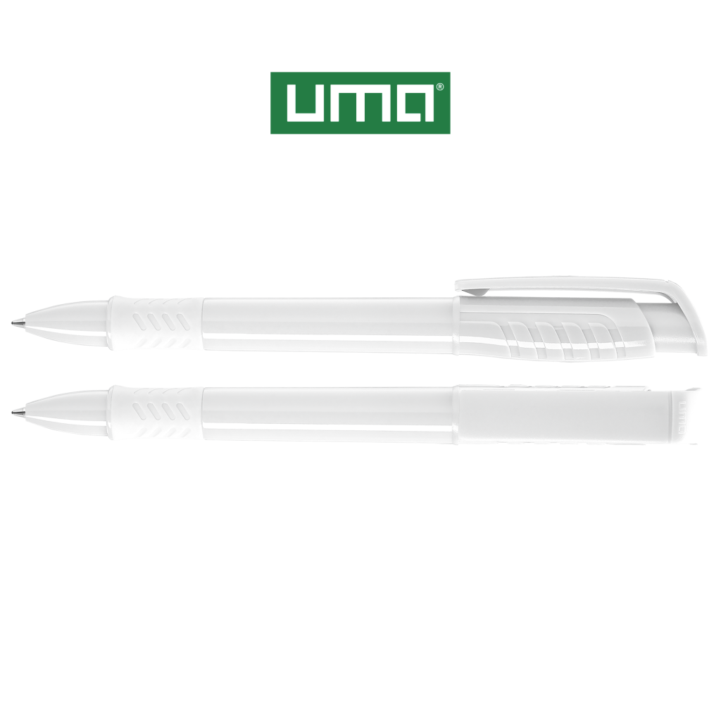 Retractable ballpoint pen with opaque glossy housing in white, grip zone and decorative ring coloured or opaque glossy black.
