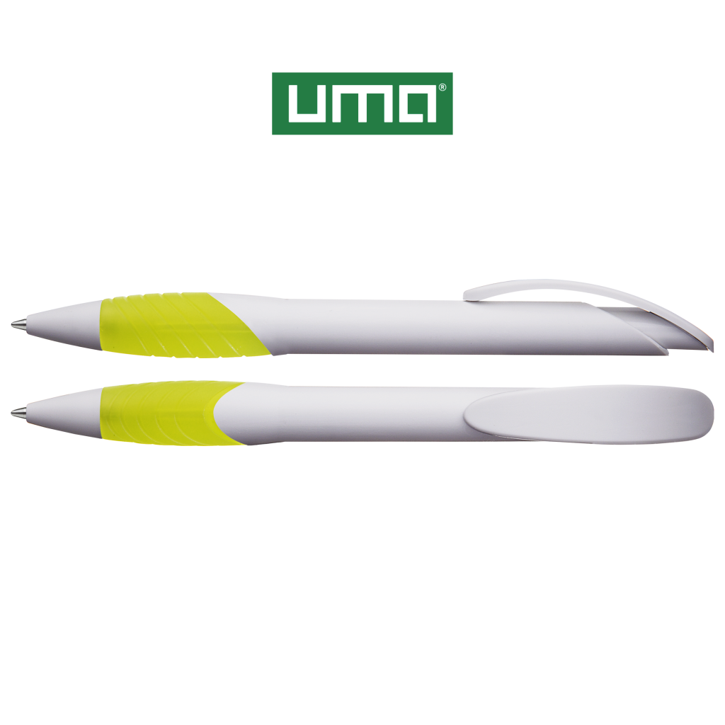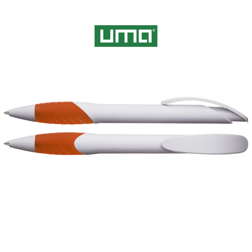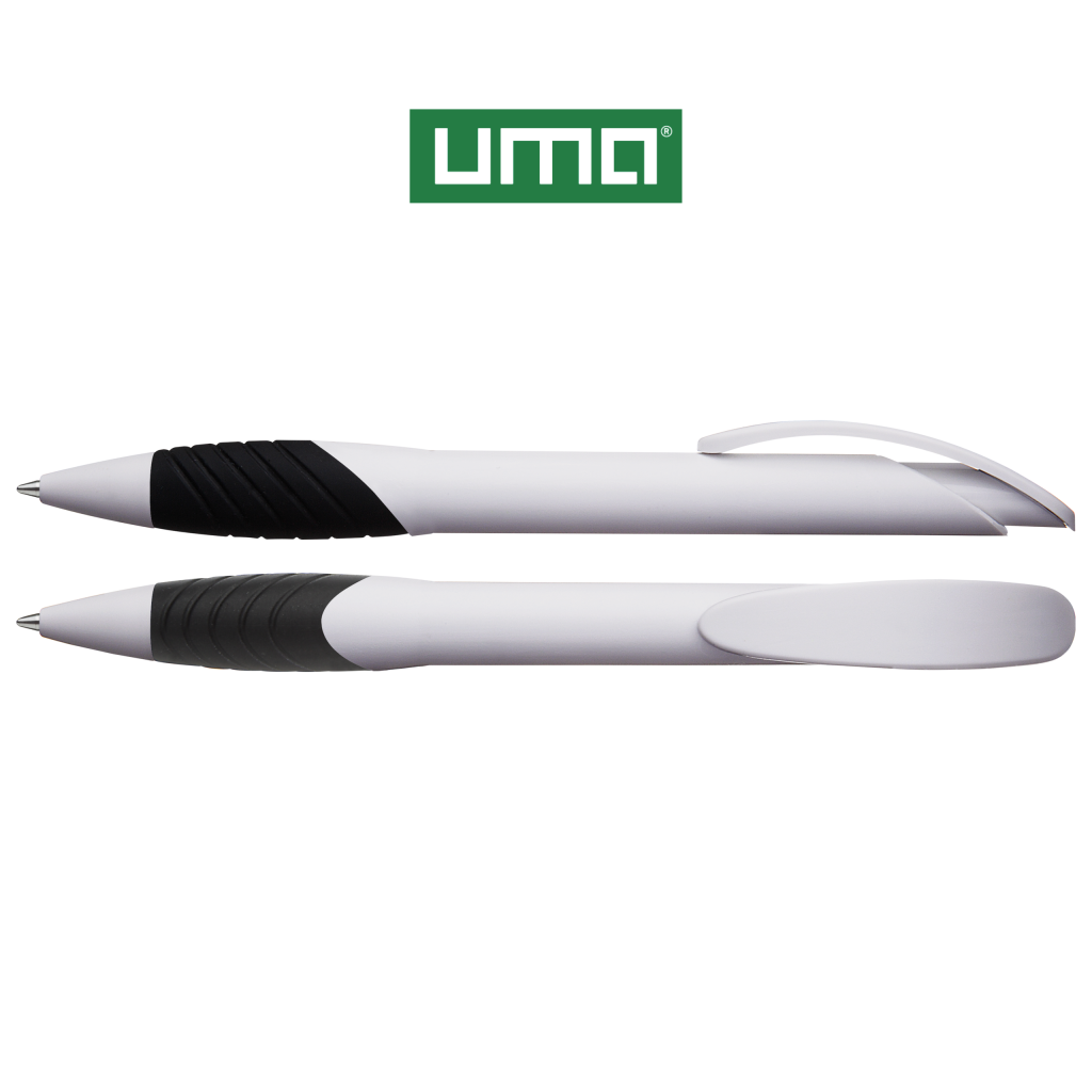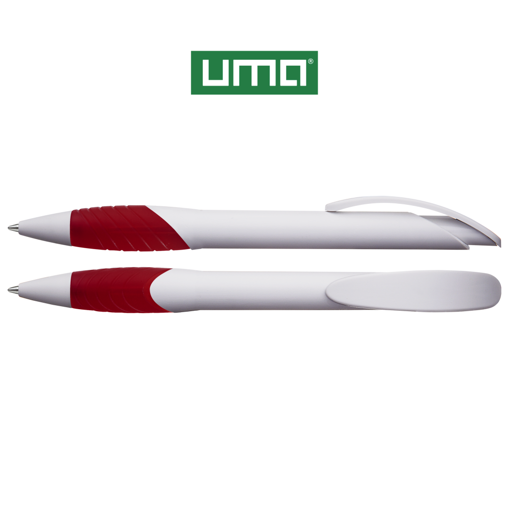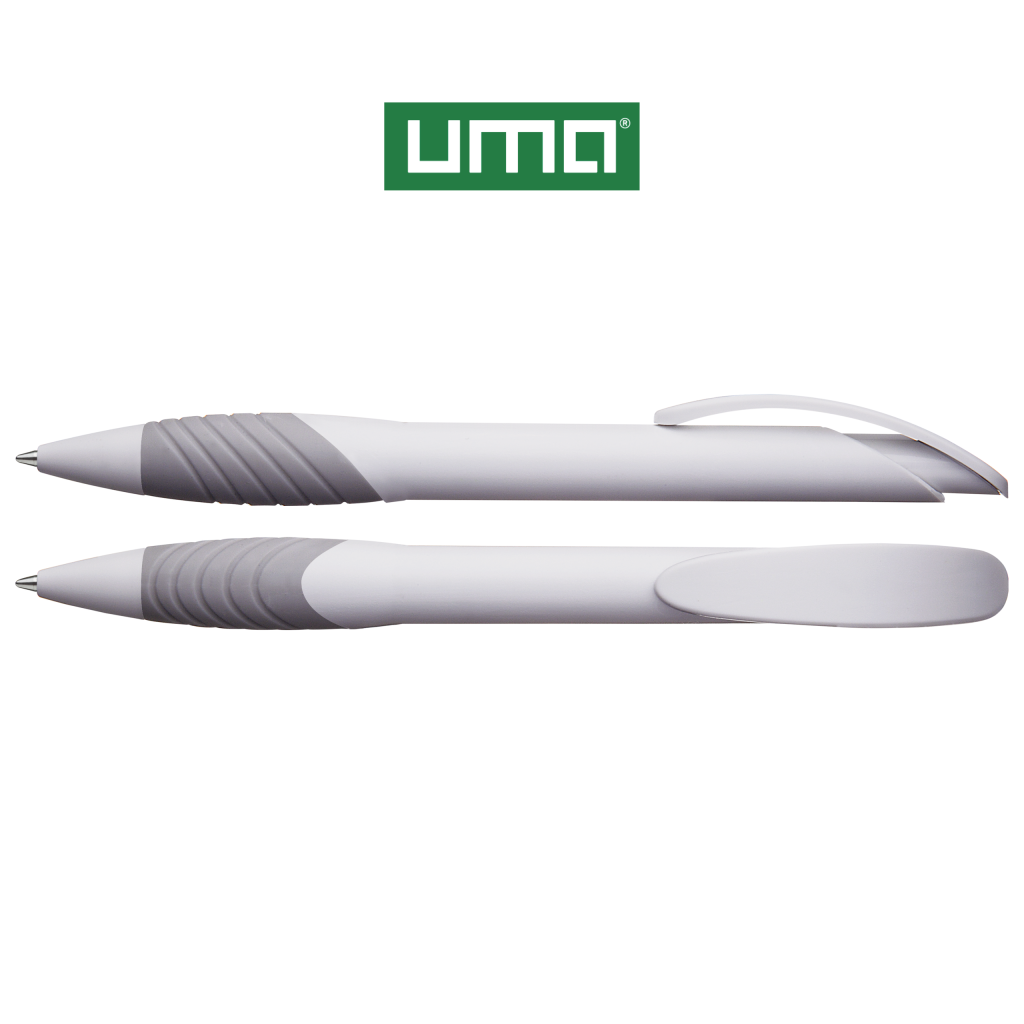 Retractable ballpoint pen with opaque matt housing, curved clip push-button and tip in white, ergonomic coloured rubber grip zone.