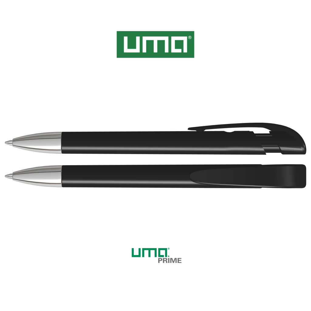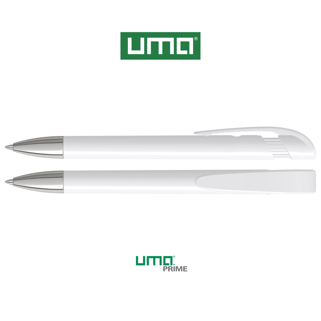 Retractable ballpoint pen with opaque glossy housing in black or white, wide curved clip button and heavy metal tip chrome plated.
