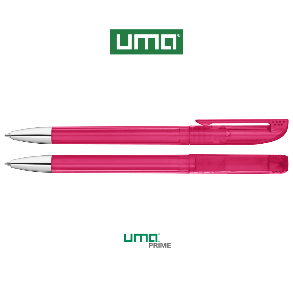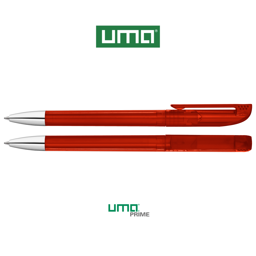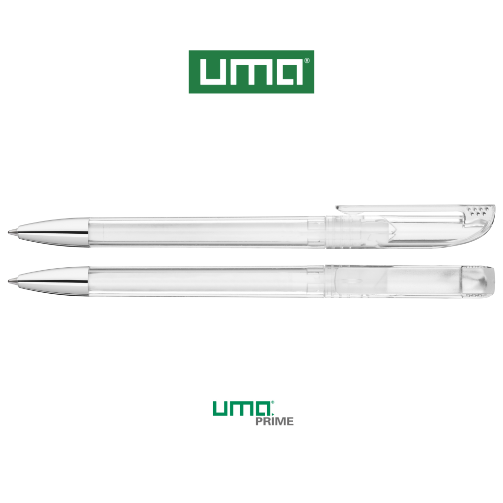 Twist ballpoint pen with transparent glossy housing, matt clip surface and tip chrome plated.