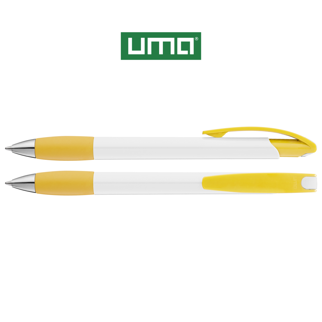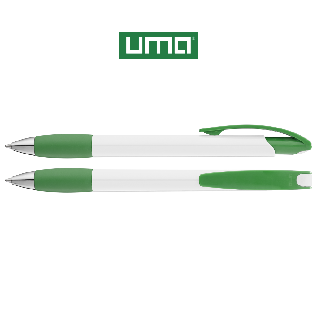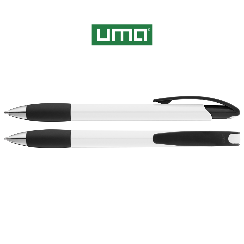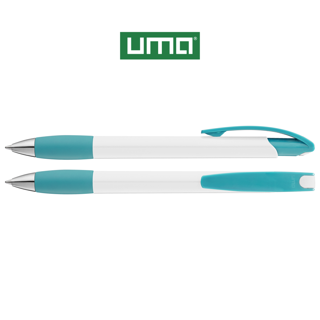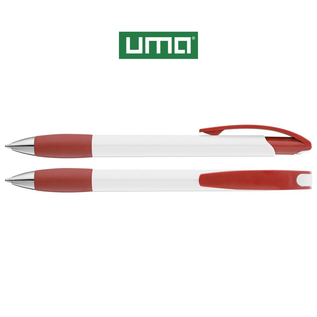 Retractable ballpoint pen with opaque glossy housing in white, coloured rubber grip zone and clip button. Plug and tip silver glossy.