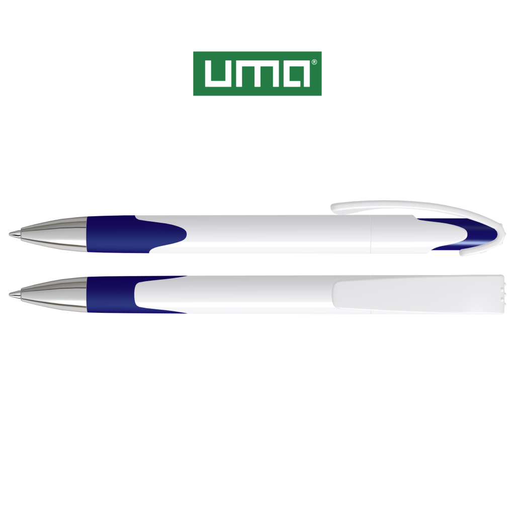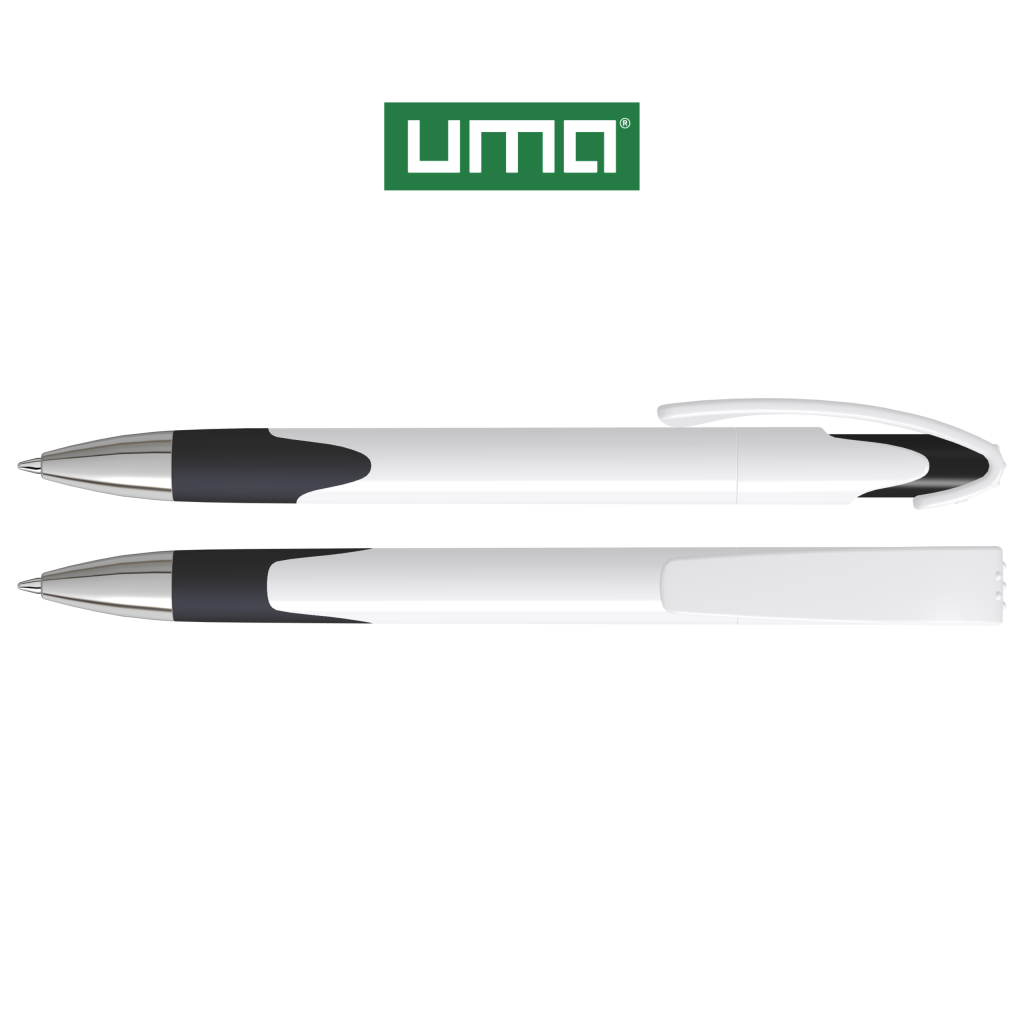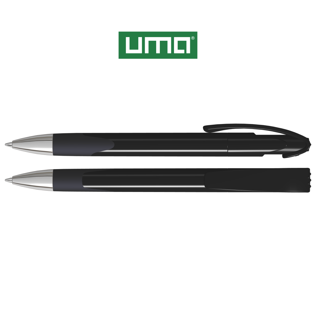 Retractable ballpoint pen with opaque glossy housing, rubber grip zone and heavy metal tip chrome plated.