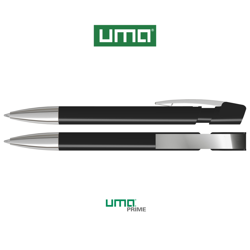 Retractable ballpoint pen with opaque glossy housing in white or black, flexible metal clip and heavy metal tip chrome plated.