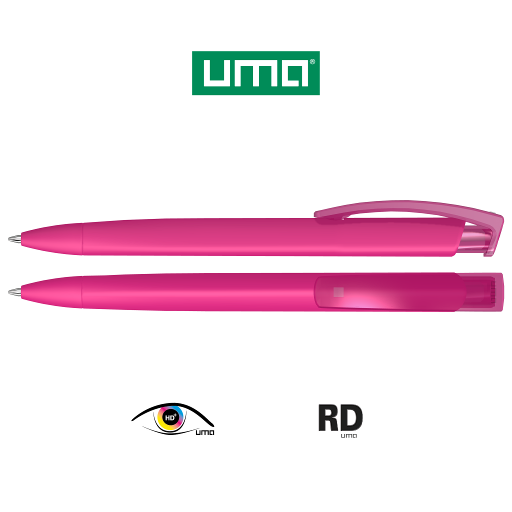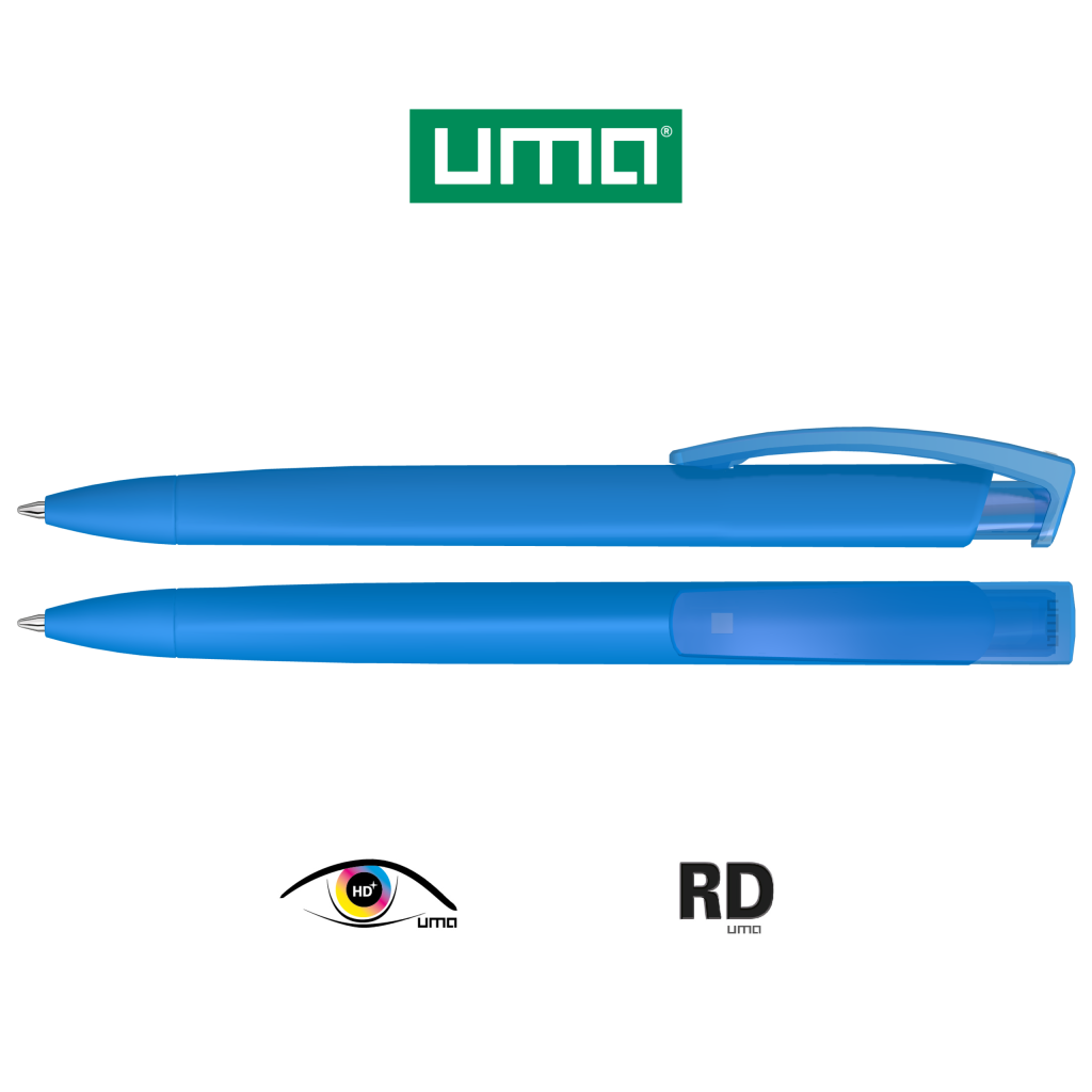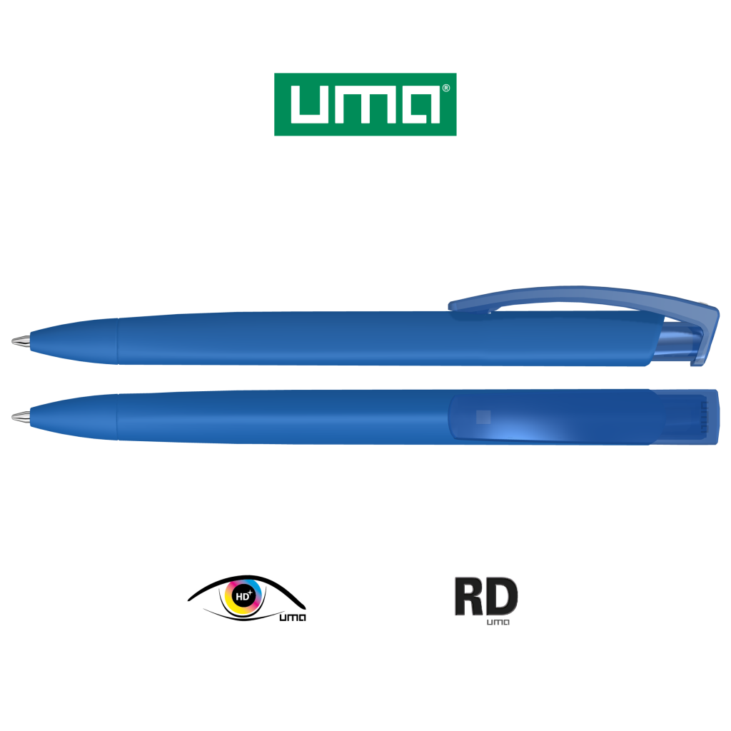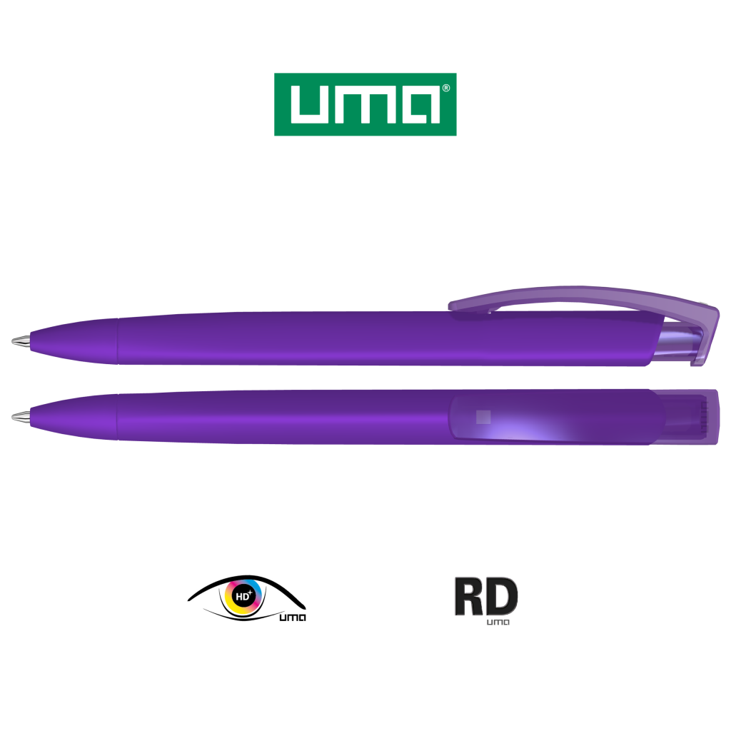 Retractable ballpoint pen with softtouch triangular housing and transparent glossy clip.