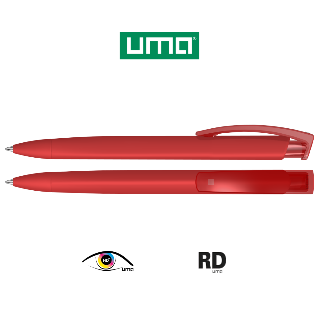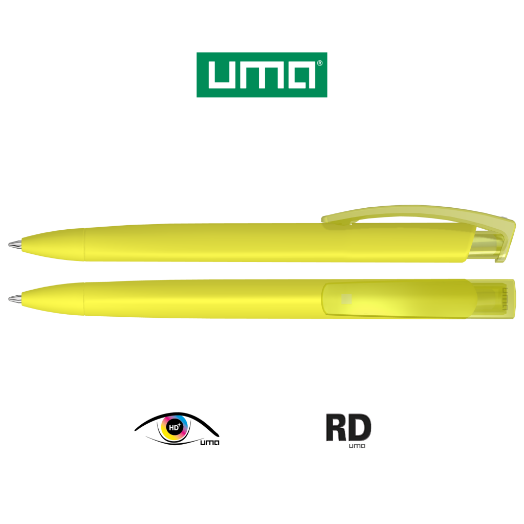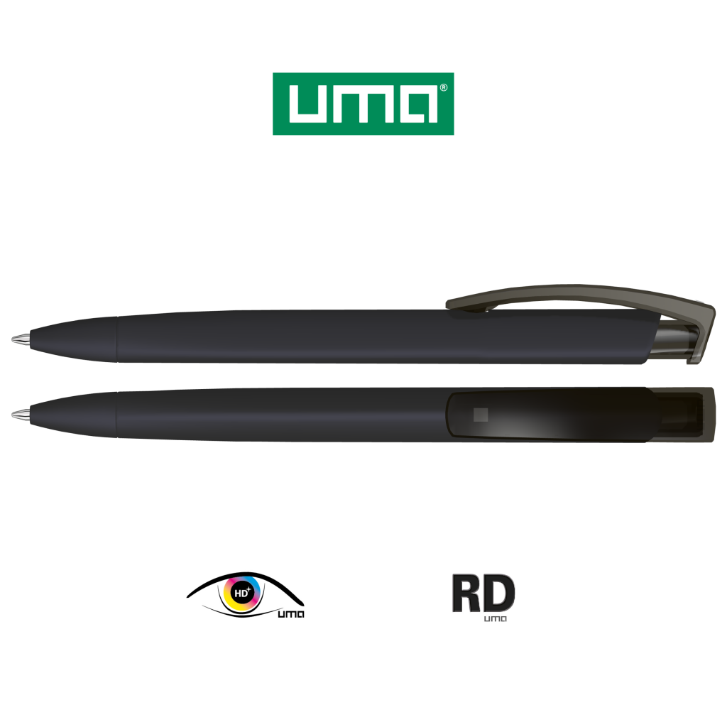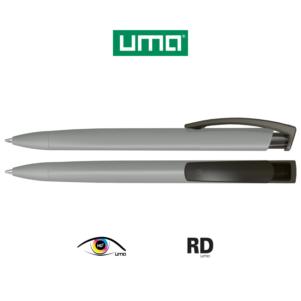 Retractable ballpoint pen with softtouch triangular housing and transparent glossy clip.
