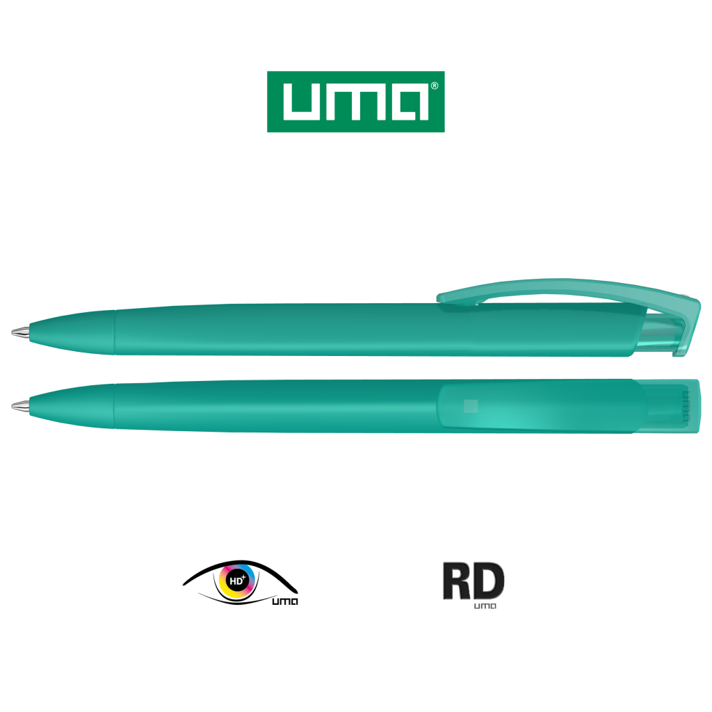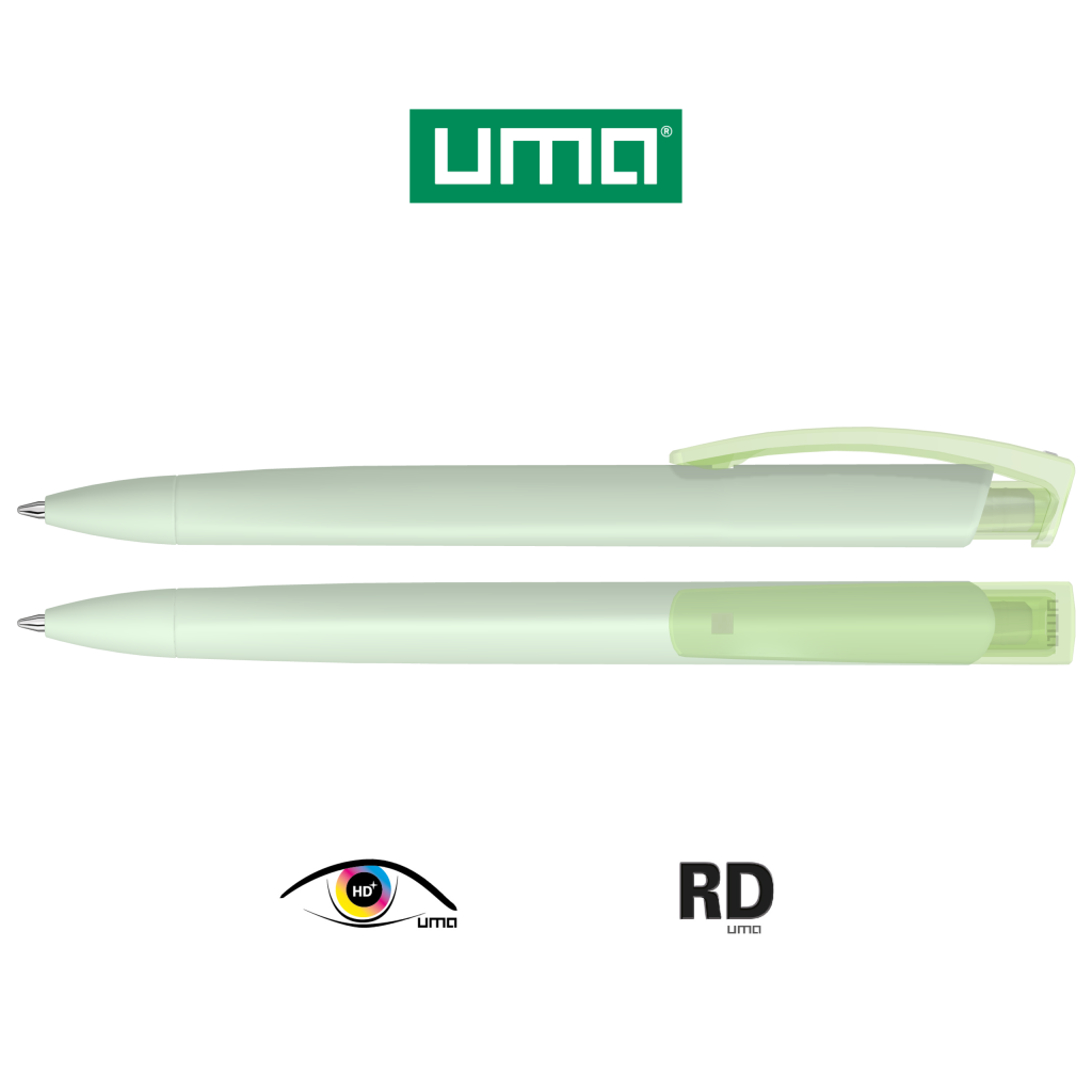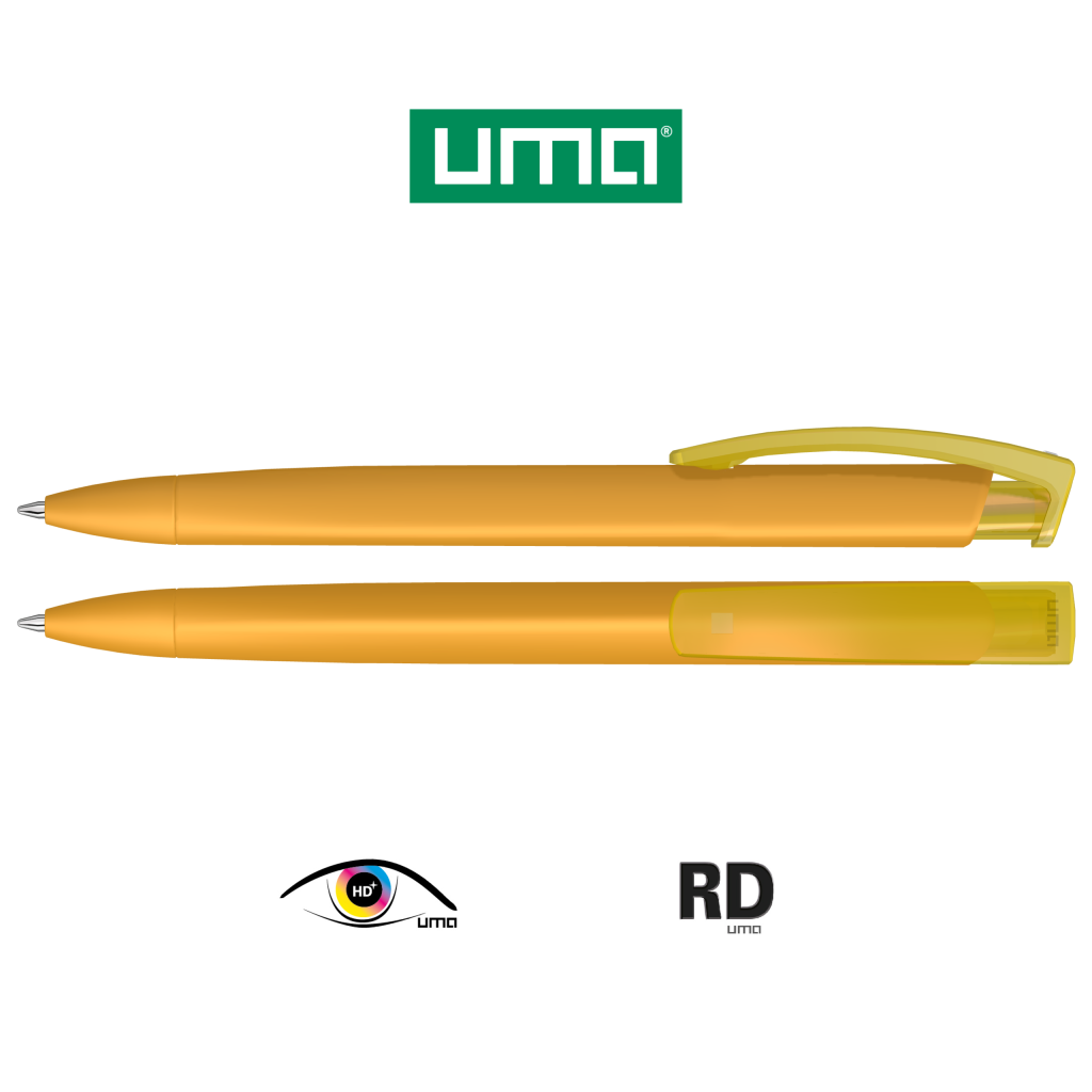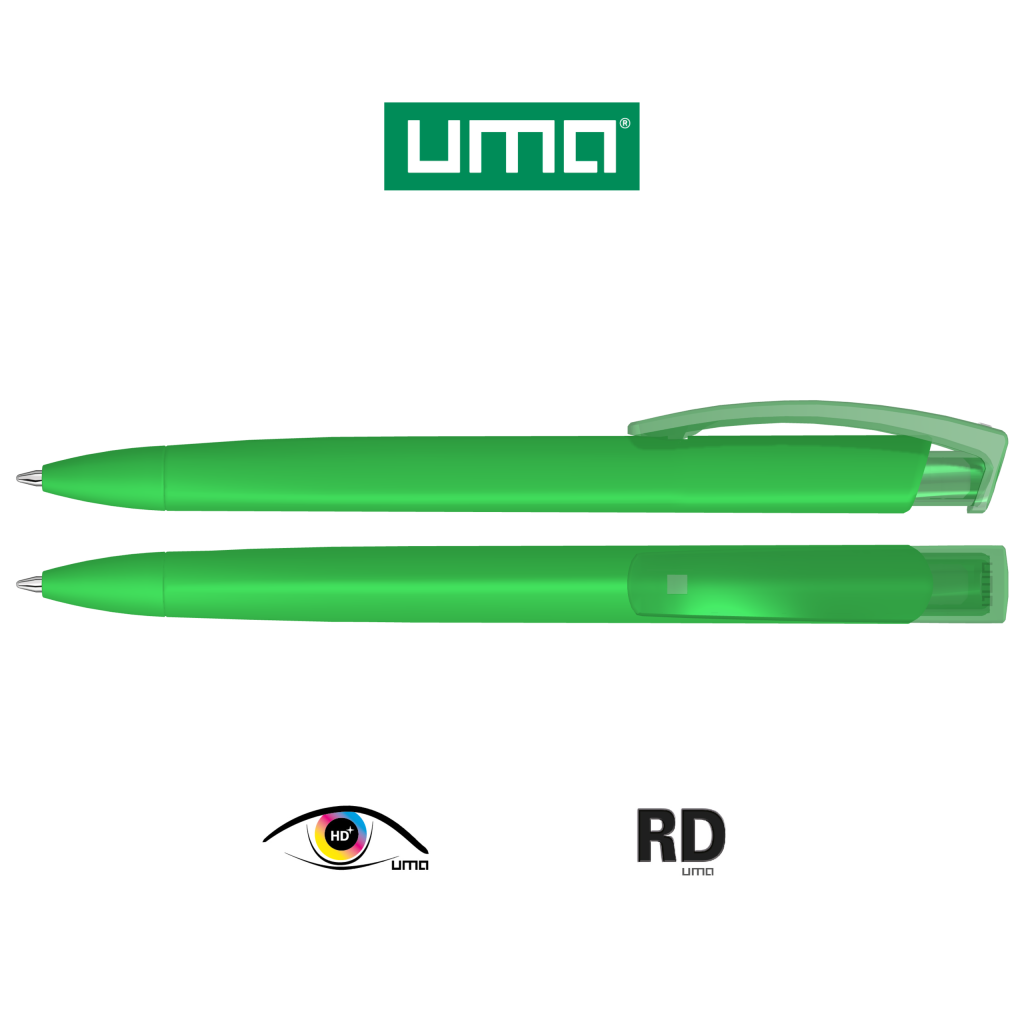 Retractable ballpoint pen with softtouch triangular housing and transparent glossy clip.