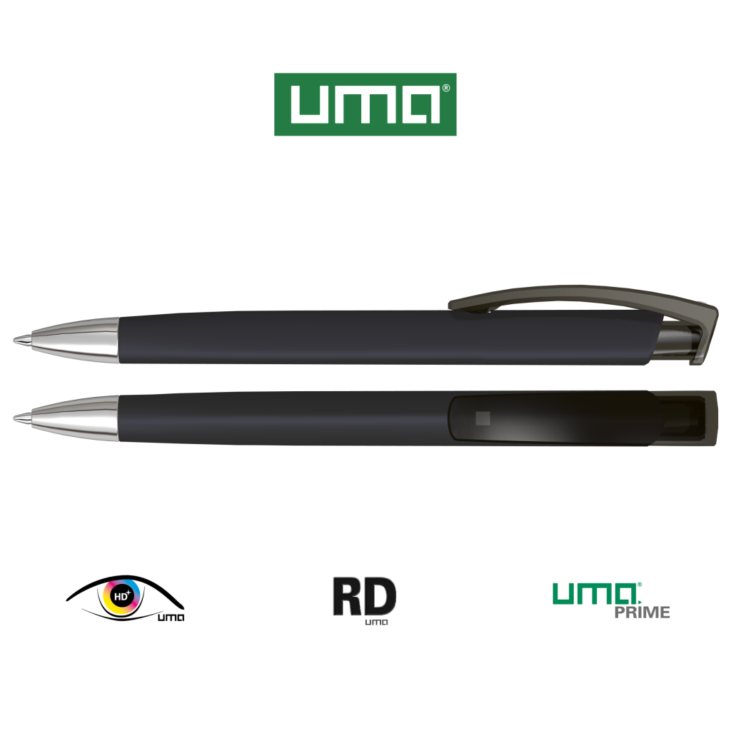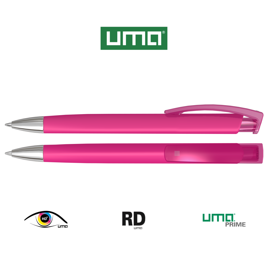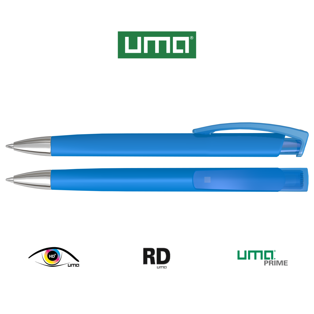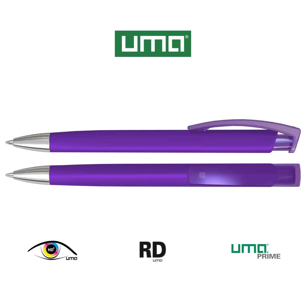 Retractable ballpoint pen with softtouch triangular housing, transparent glossy clip and heavy metal tip chrome plated.
