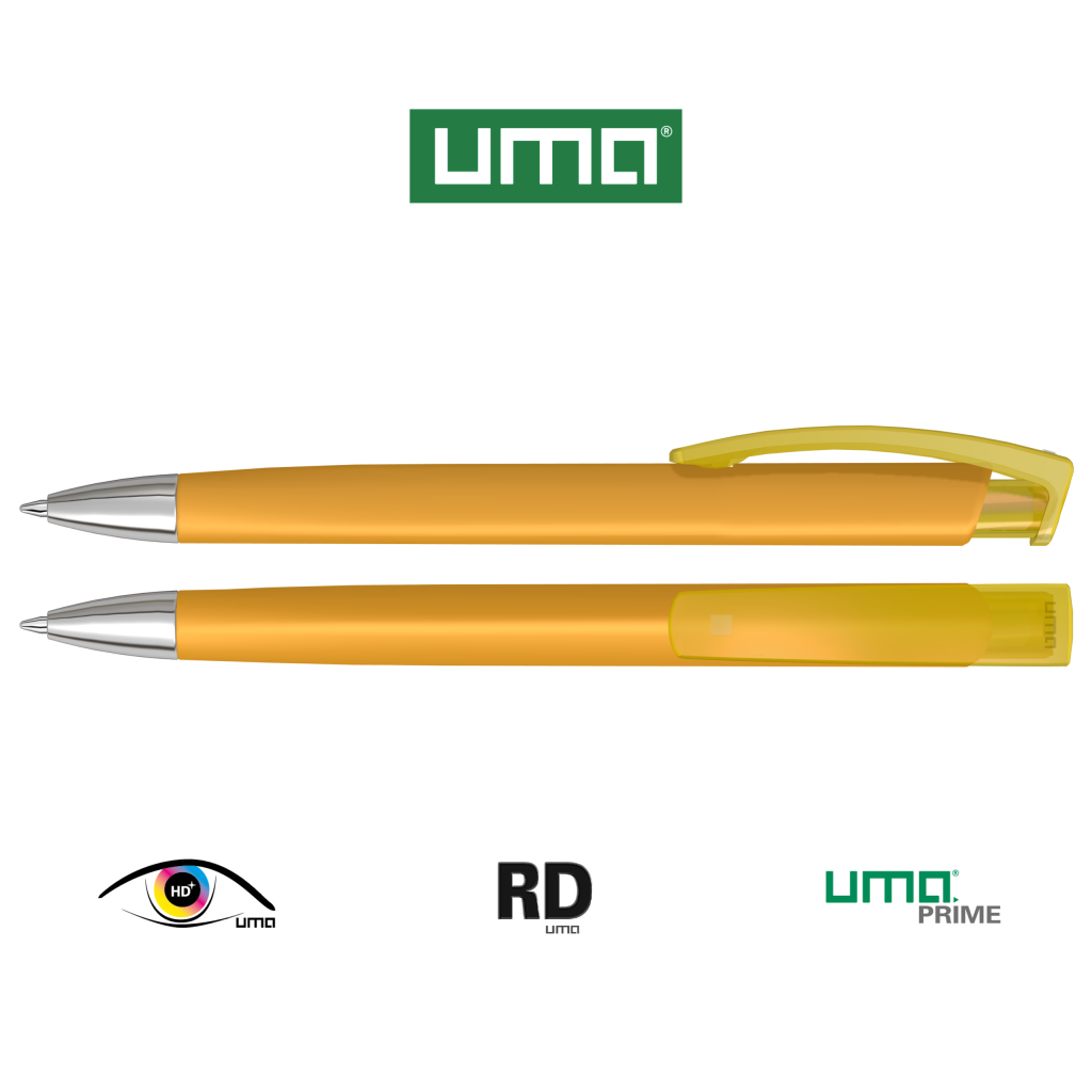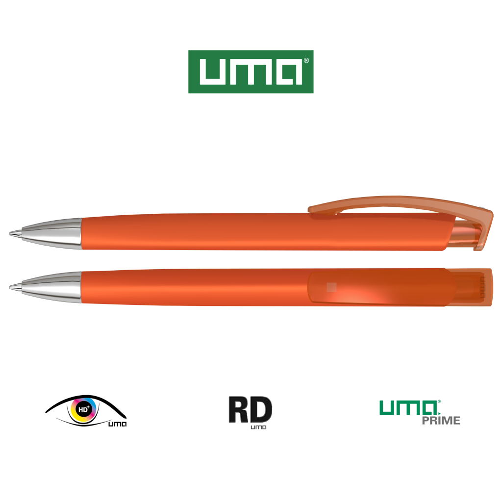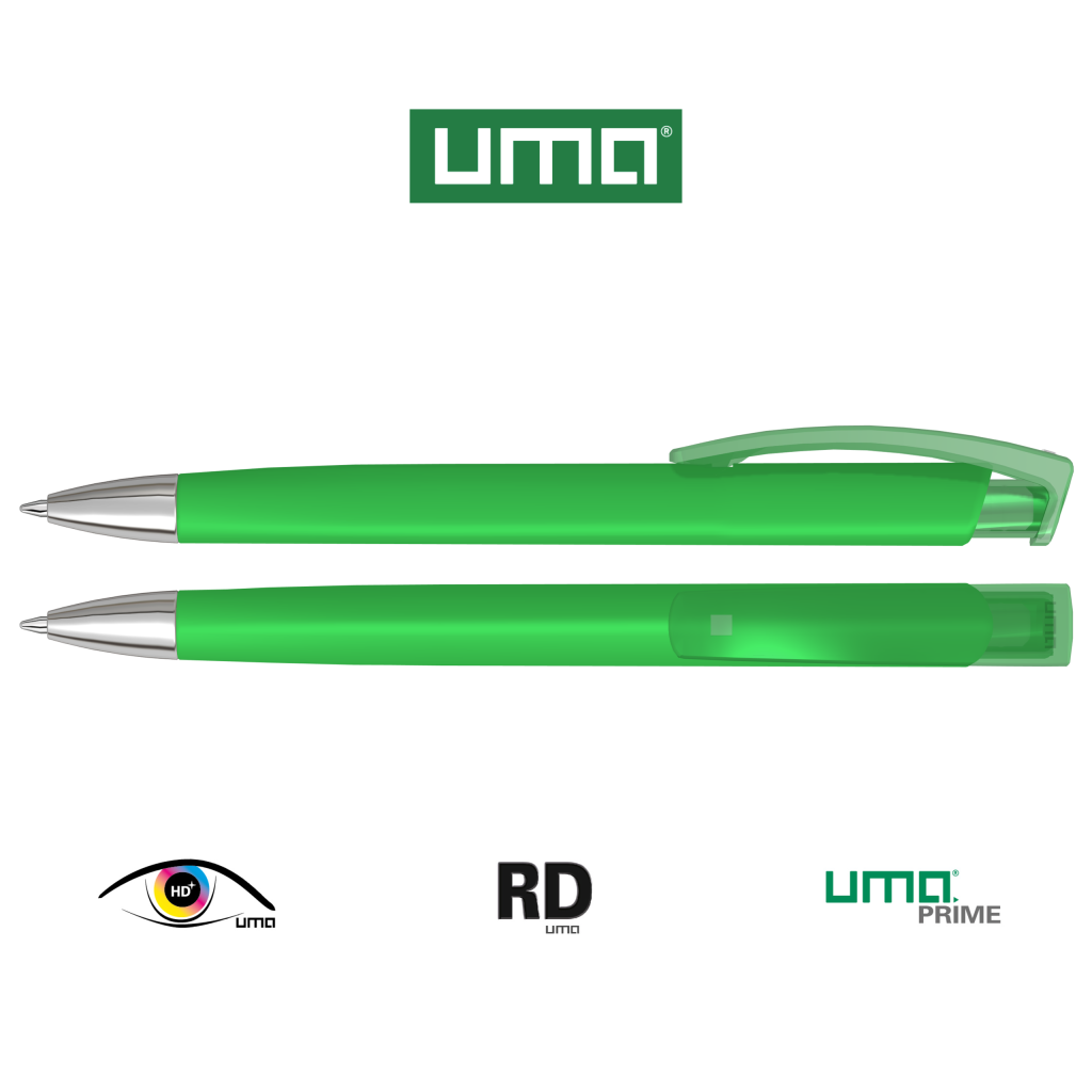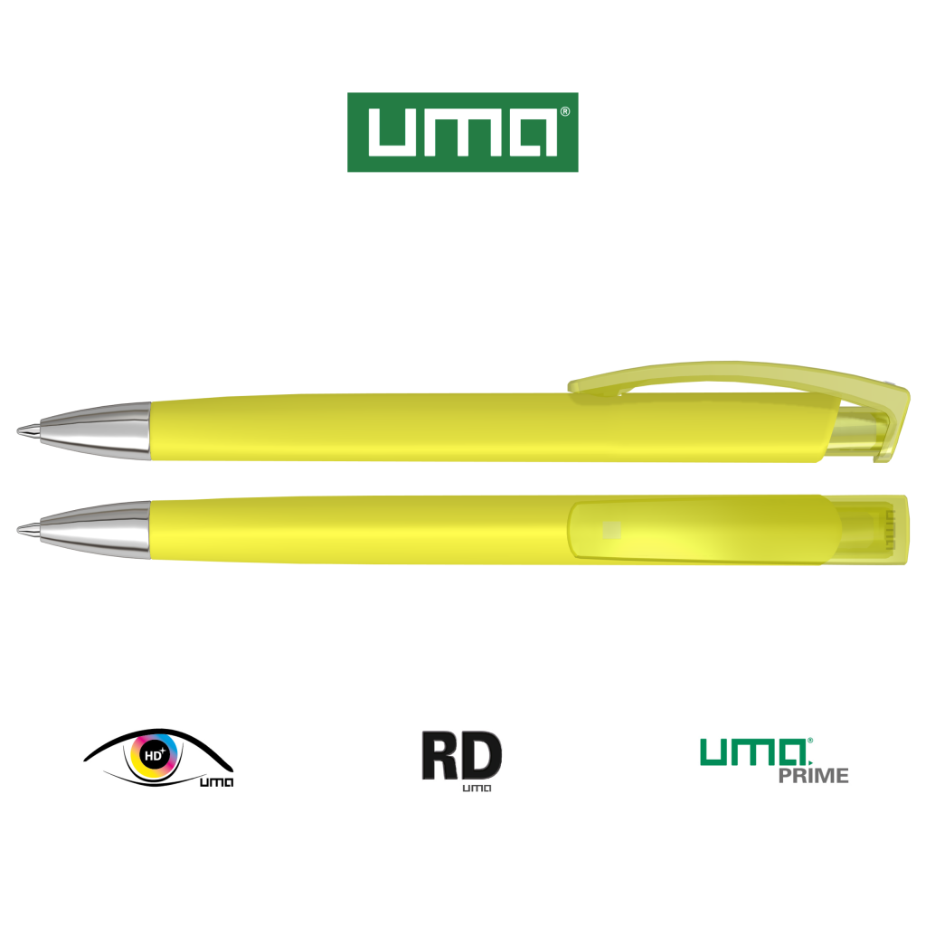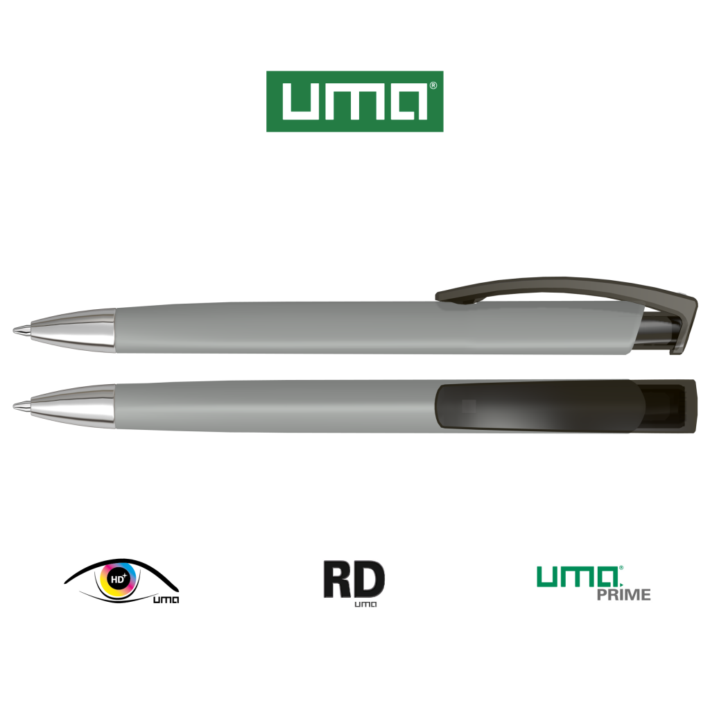 Retractable ballpoint pen with softtouch triangular housing, transparent glossy clip and heavy metal tip chrome plated.