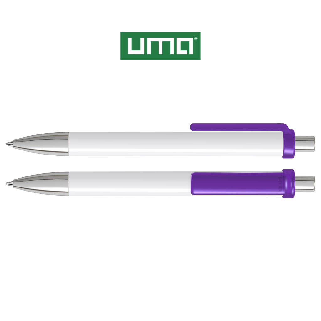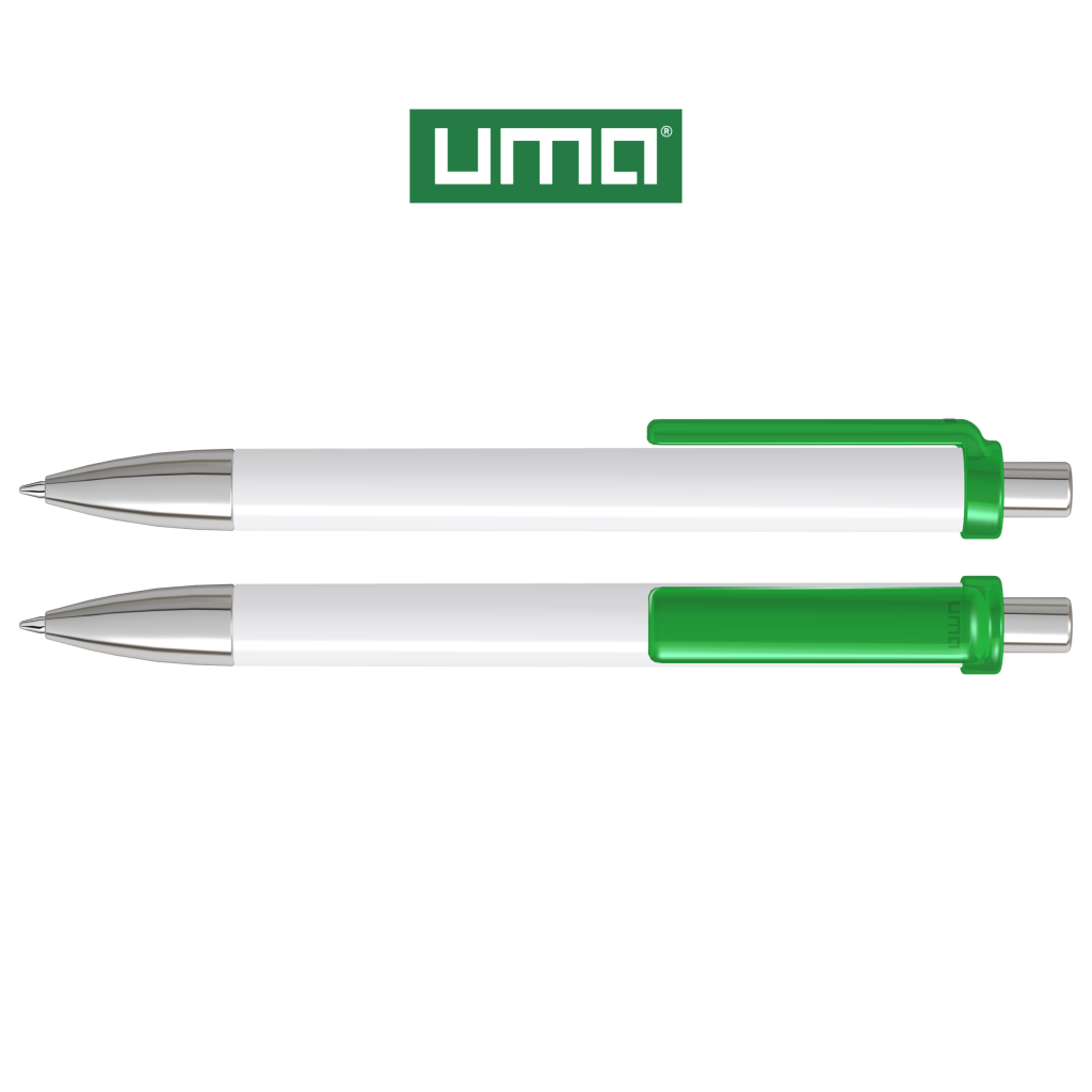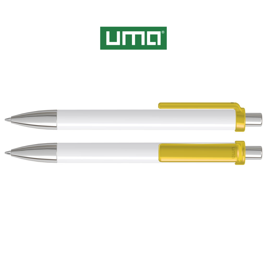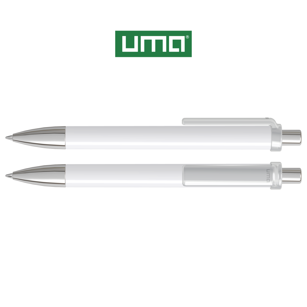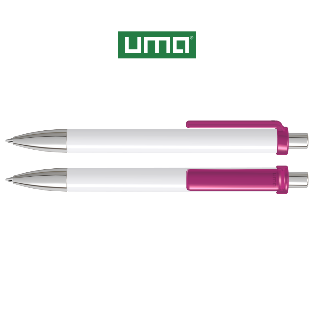 Retractable ballpoint pen with opaque glossy housing, transparent glossy clip, metal tip and metal push-button chrome plated.