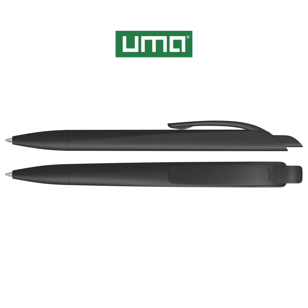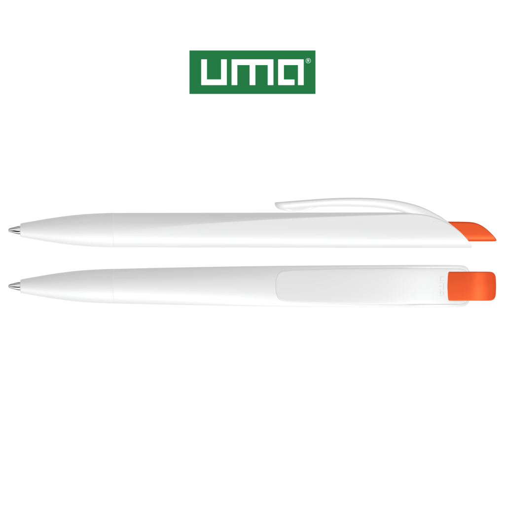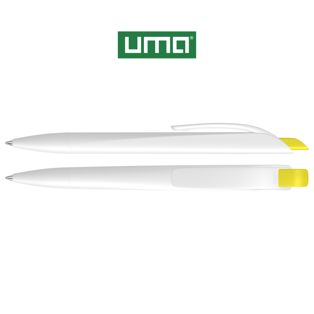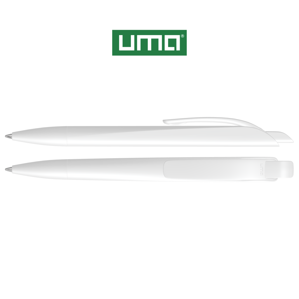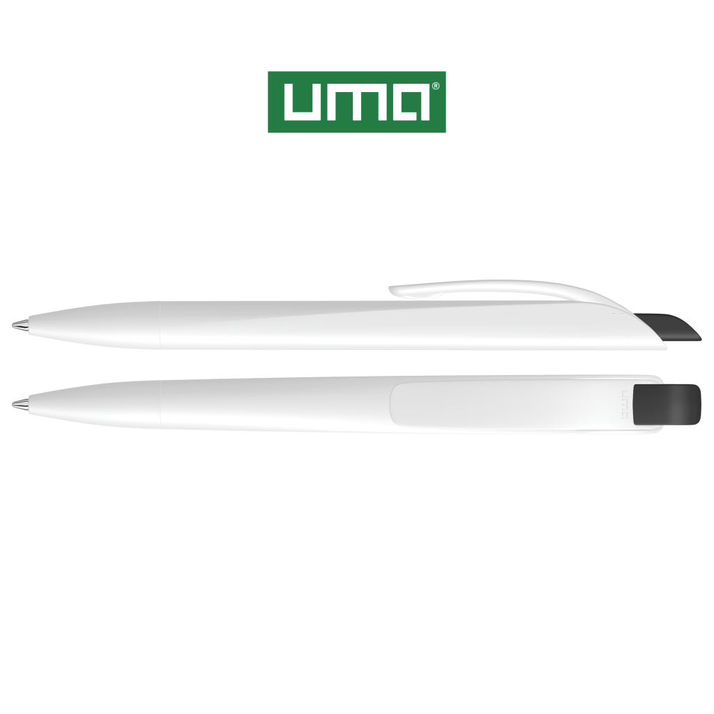 Retractable ballpoint pen with geometric changes in the barrel. Opaque matt housing in black or white with curved clip and coloured push-button.
