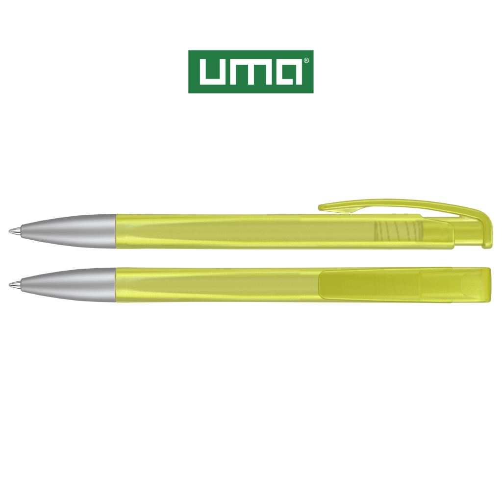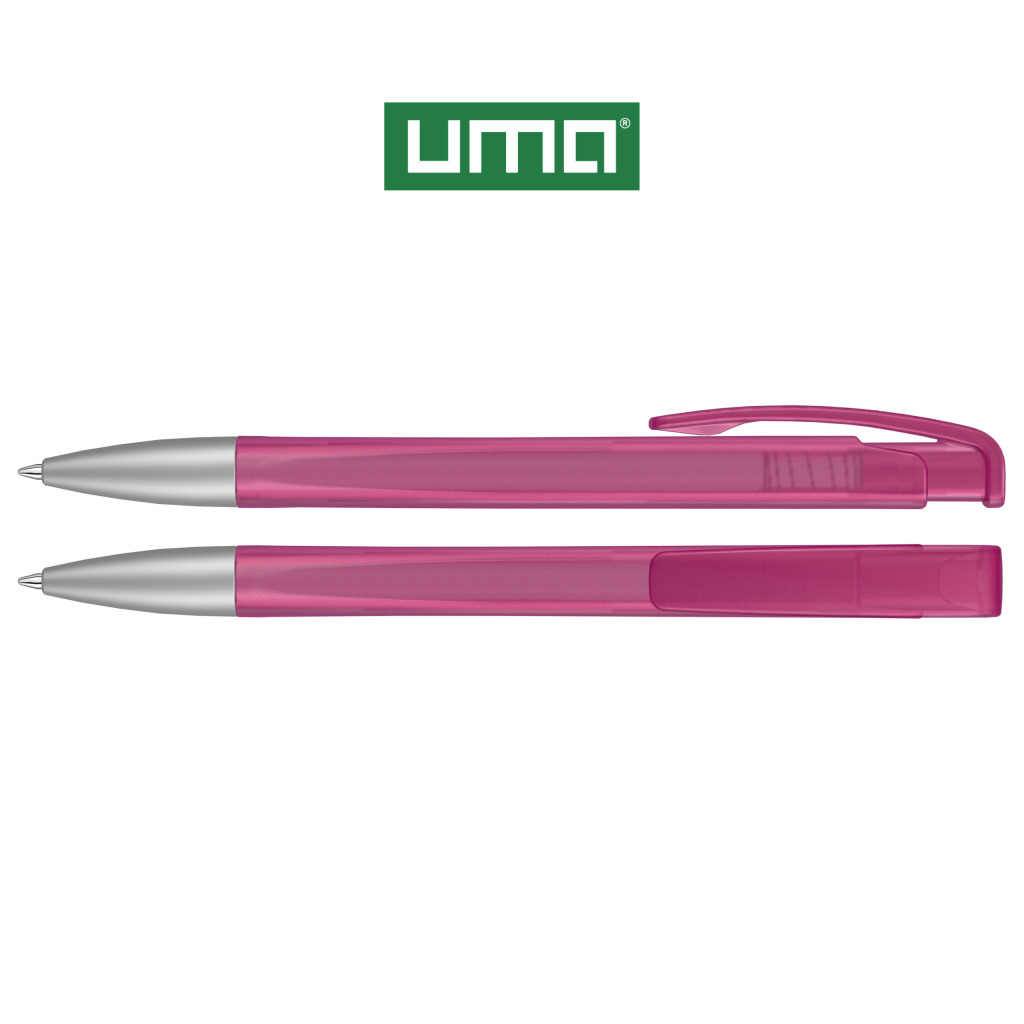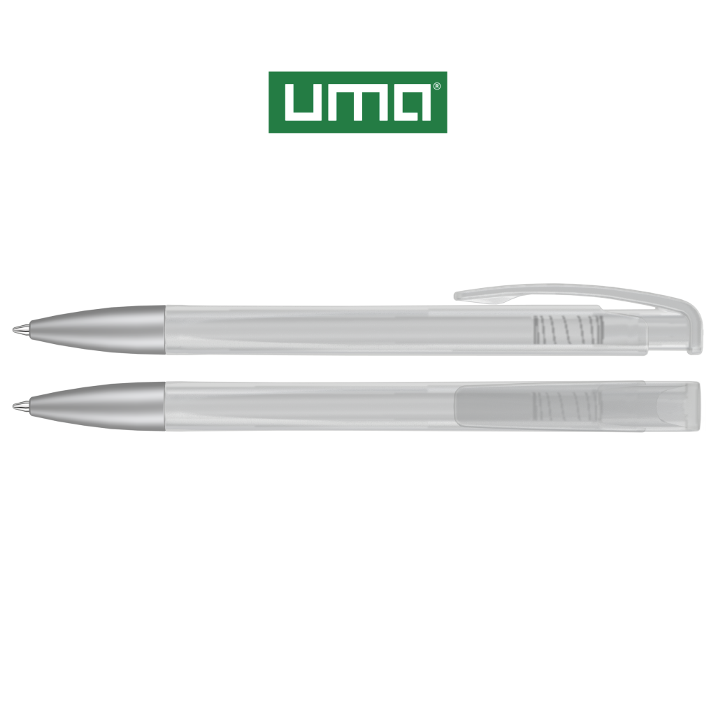 Retractable ballpoint pen with geometric changes in the barrel, transparent frosted housing and metal tip matt chrome plated.