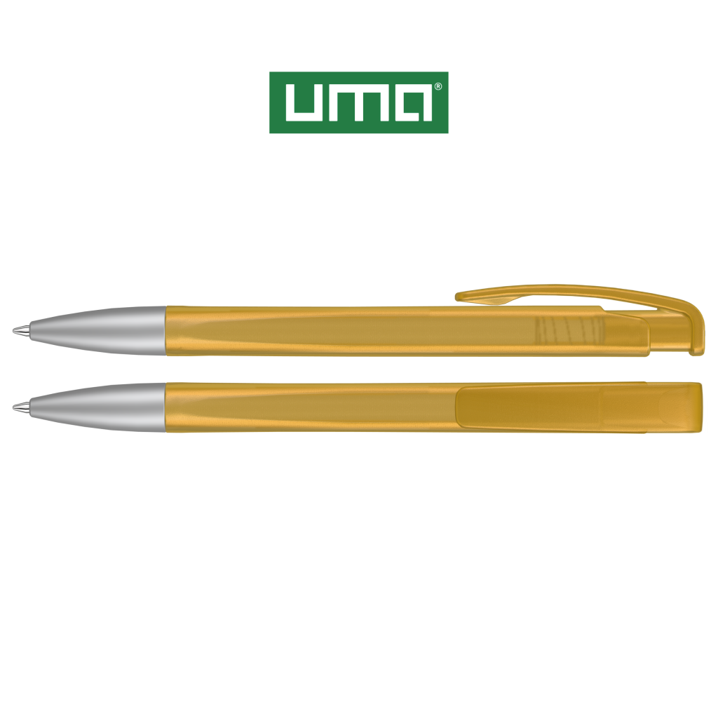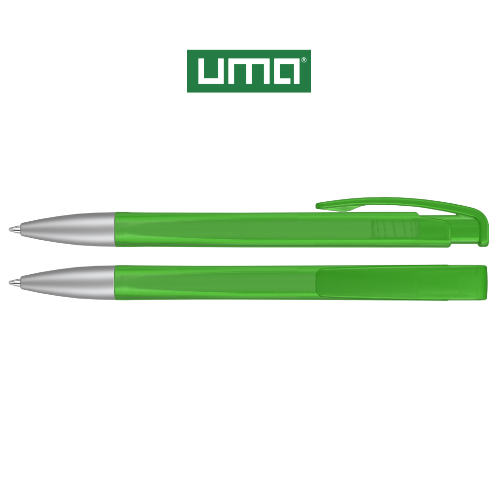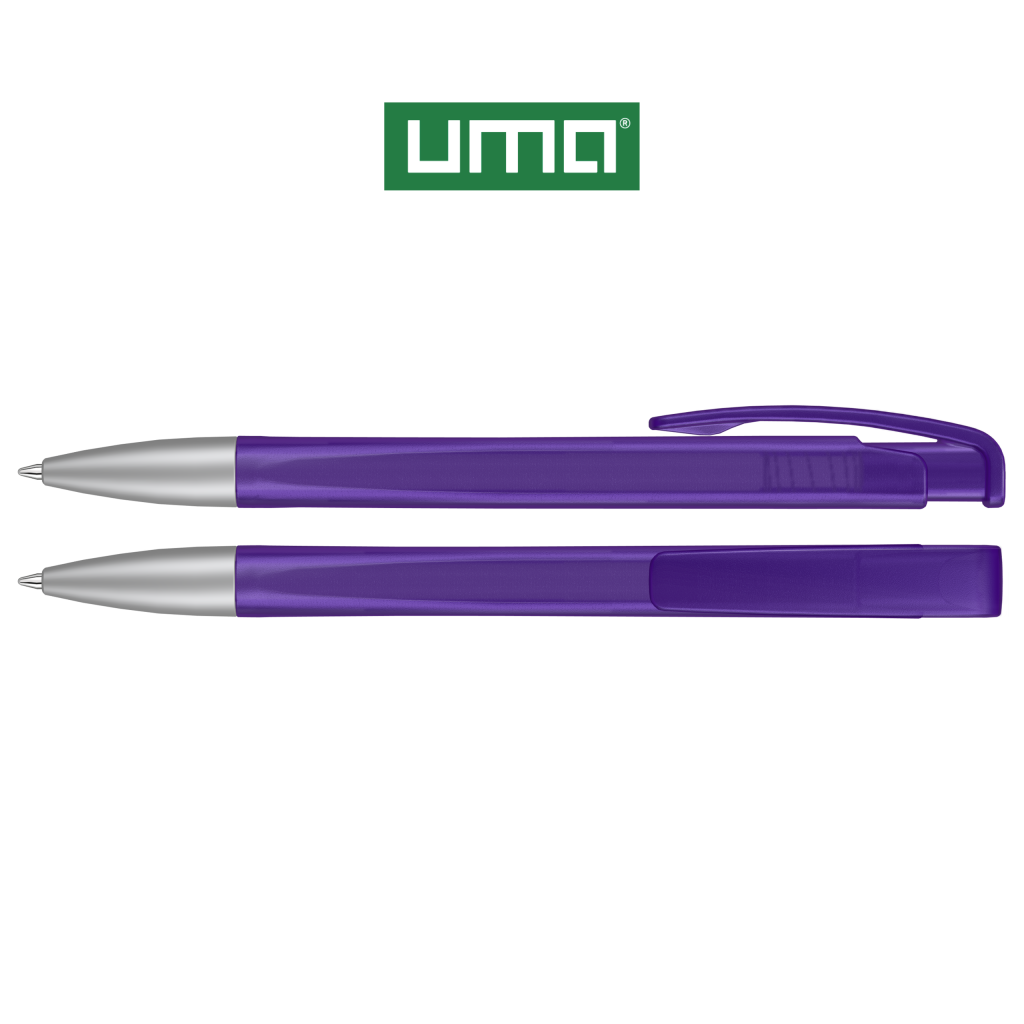 Retractable ballpoint pen with geometric changes in the barrel, transparent frosted housing and metal tip matt chrome plated.