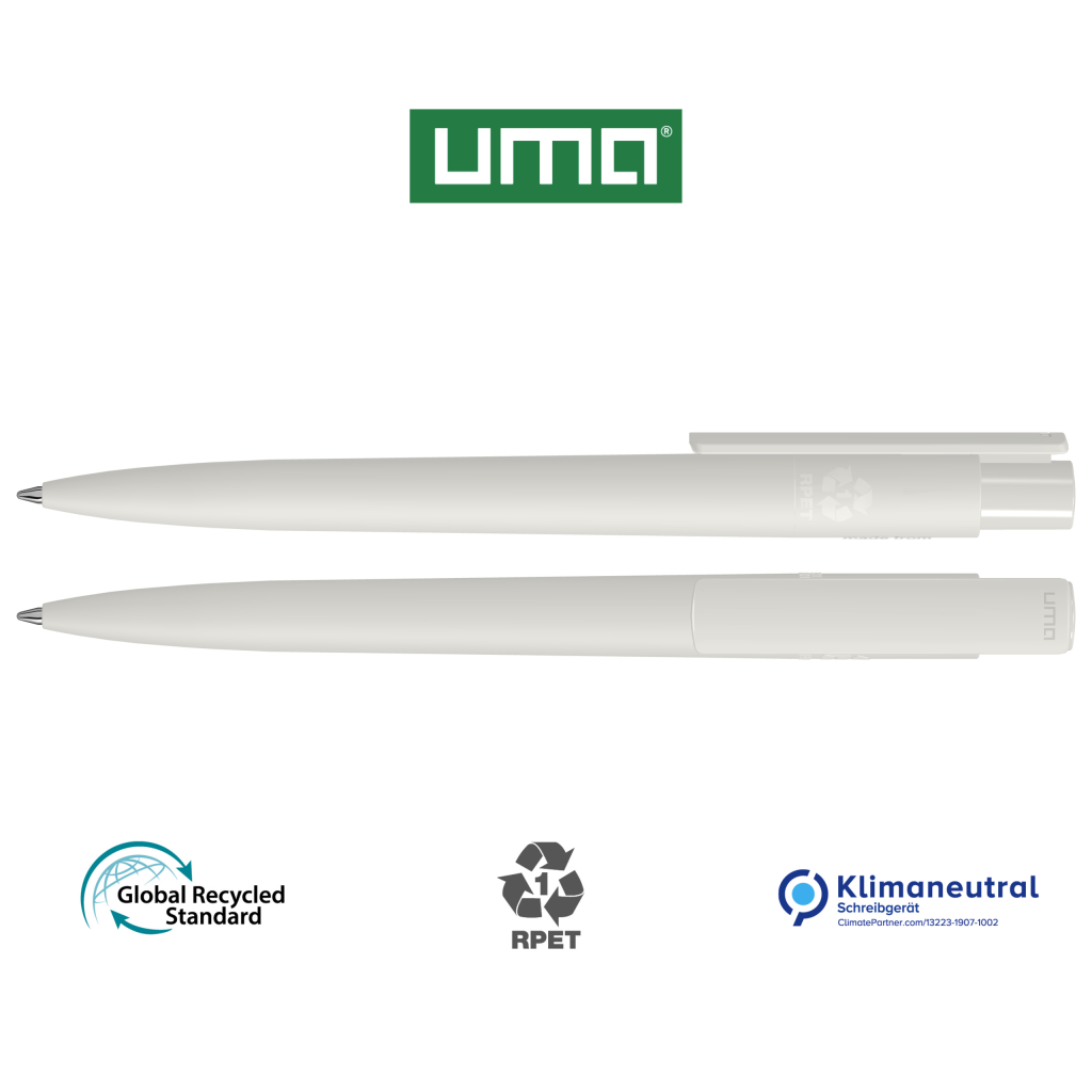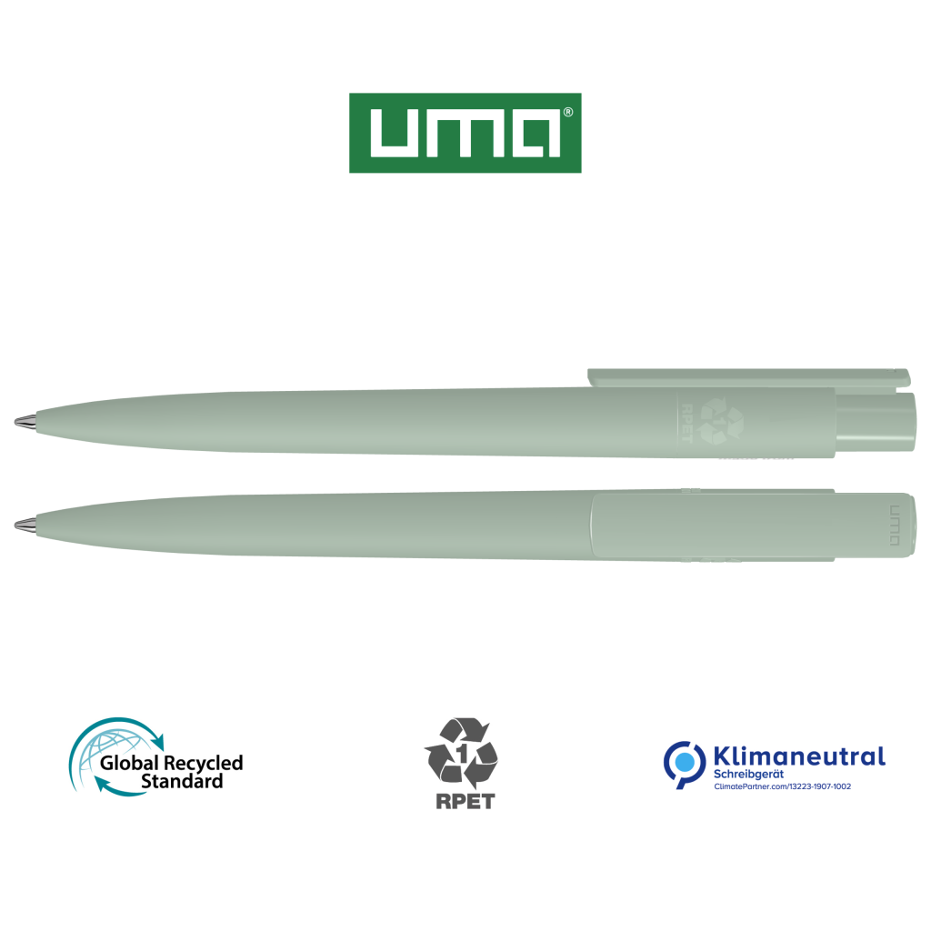 Retractable ballpoint pen made of ocean bound PET material with opaque matt housing and clip. Ocean-bound plastic, also known as Social Plastic®, collected through Plastic Bank is upcycled in Europe into a recycled PET writing instrument for long-lasting and sustainable advertisment.