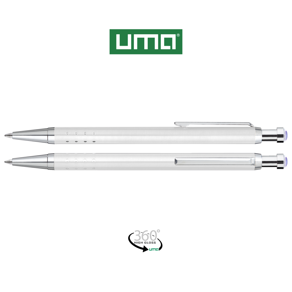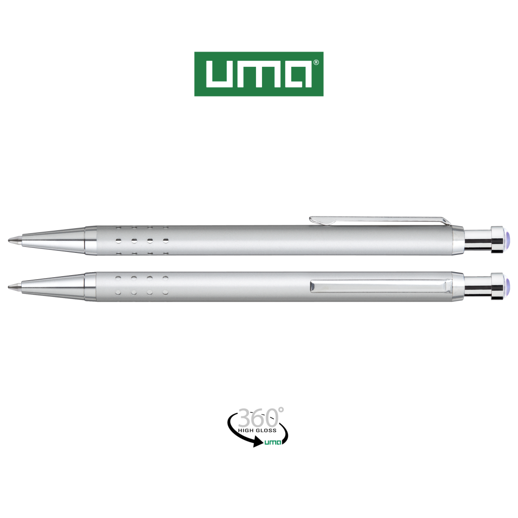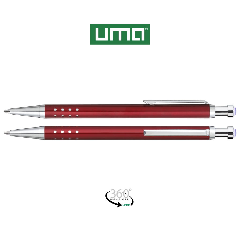 Slim metal retractable ballpoint pen with lacquered housing and perforated grip zone. Metal fittings chrome plated and individual designable doming.
