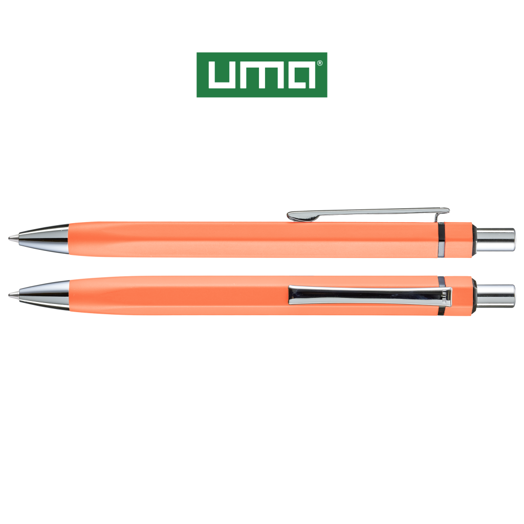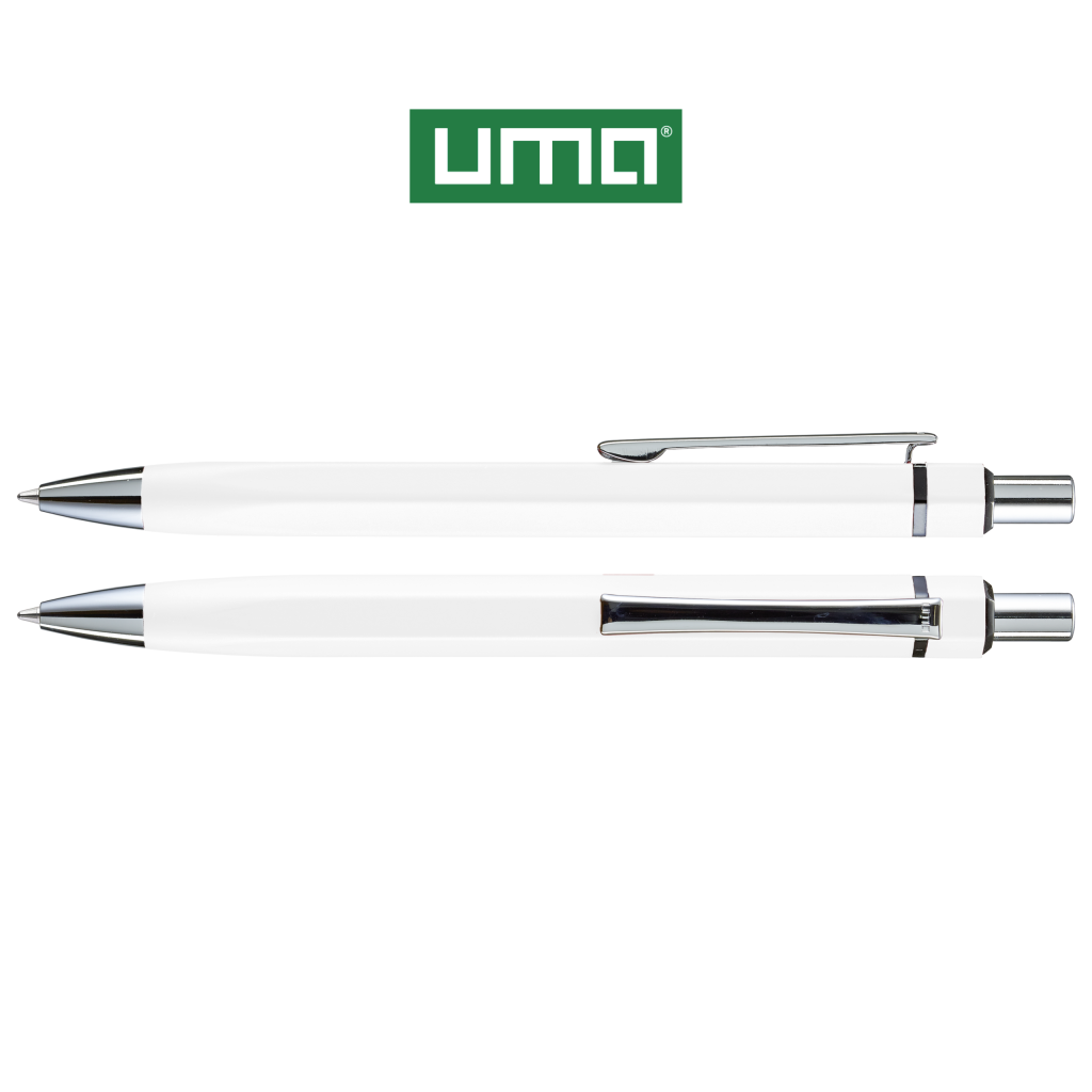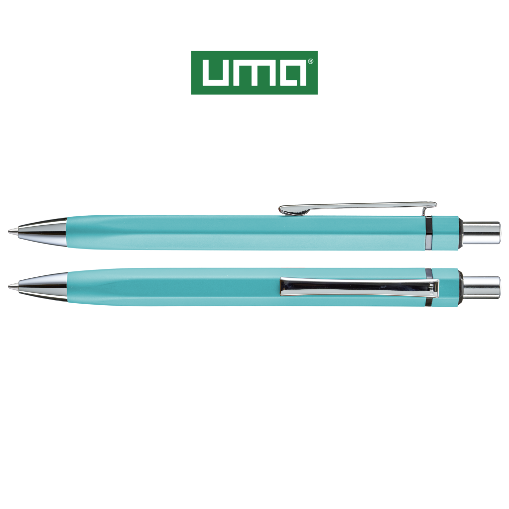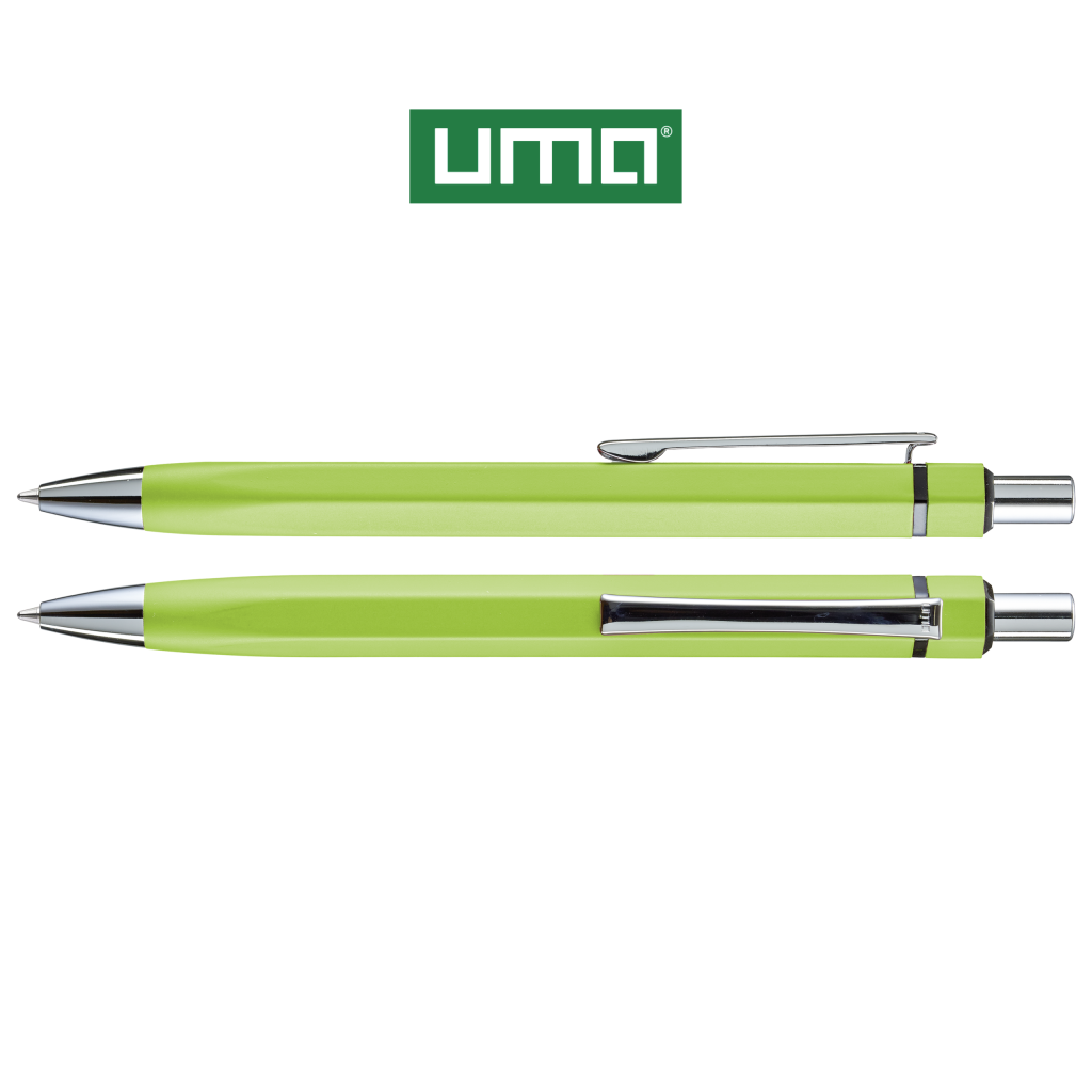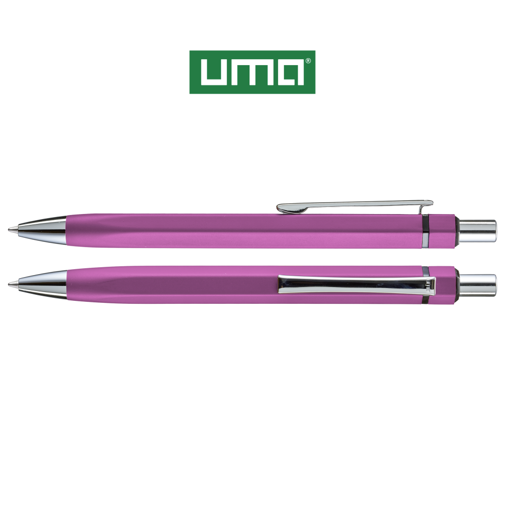 Metal retractable ballpoint pen with matt lacquered, hexagonal aluminium barrel. Metal clip, metal tip and push-button in glossy silver. Ring in glossy black.