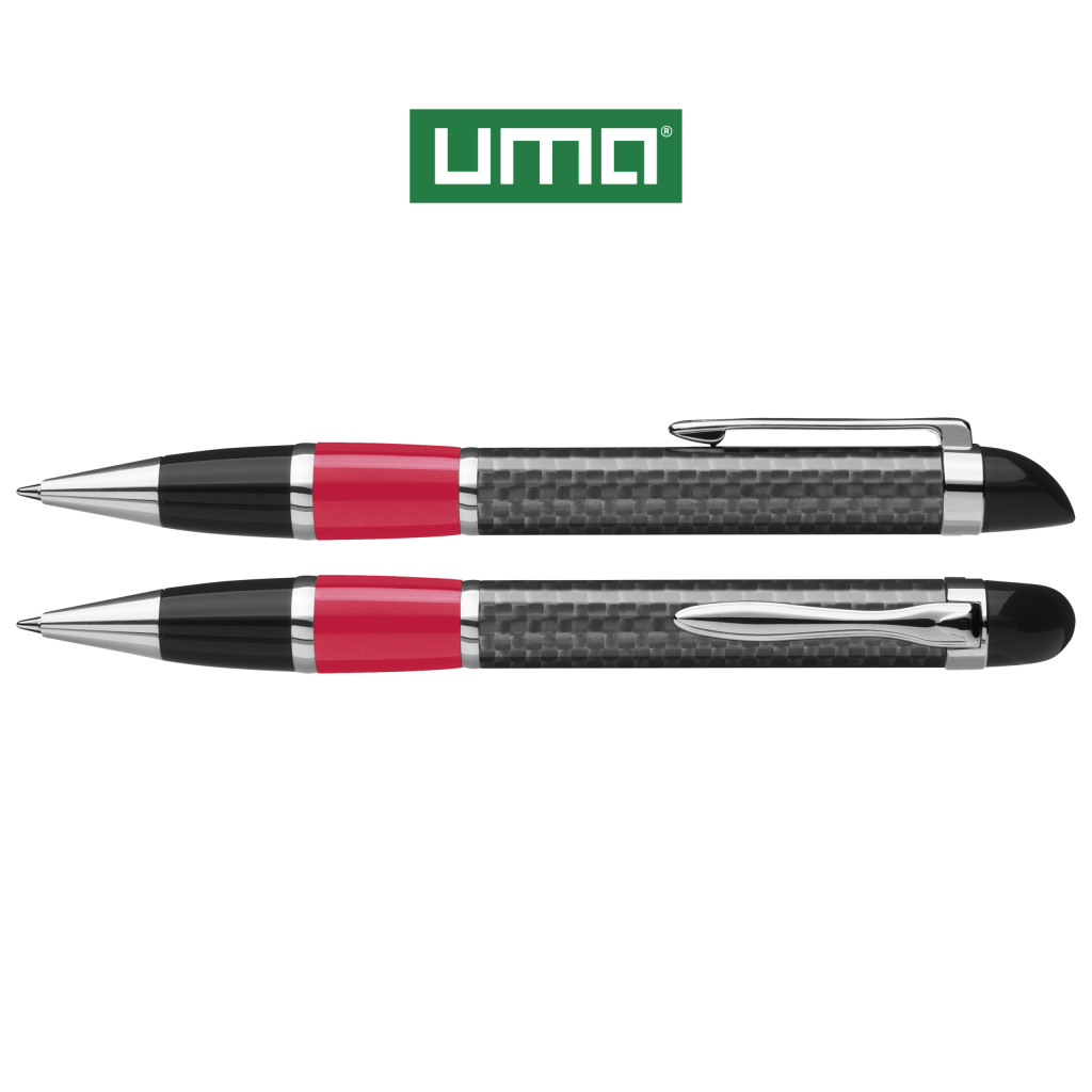 Carbon fibre metal twist ballpoint pen with coloured grip zone, flexible metal clip, metal ring and metal tip chrome plated.