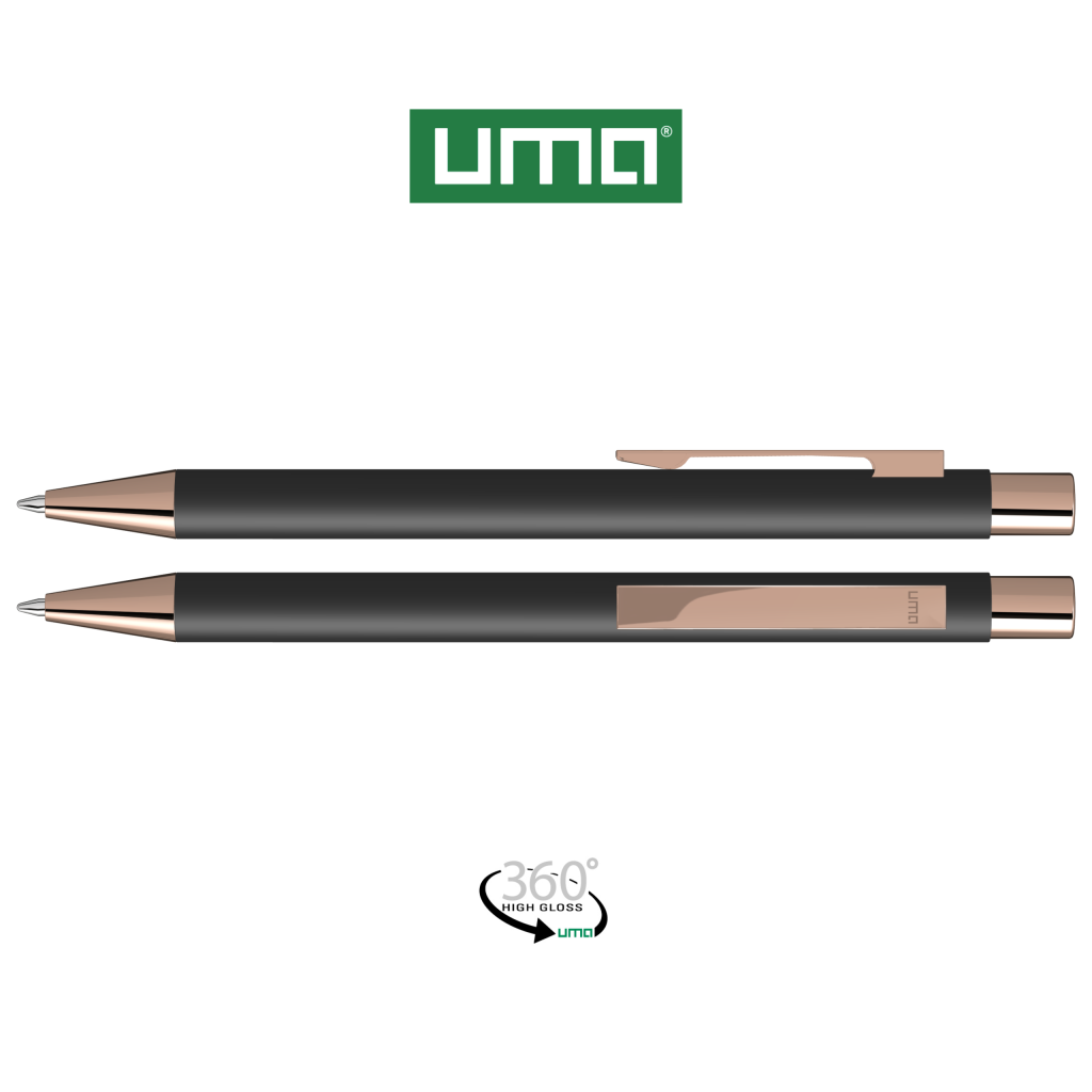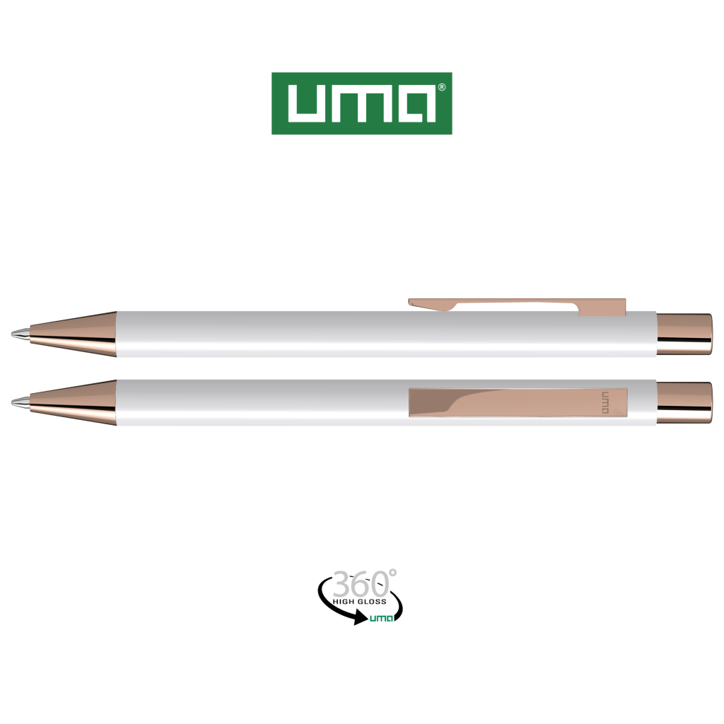 Metal retractable ballpoint pen with glossy housing in white or matt black. Metal clip, metal tip and push-button rose gold plated.