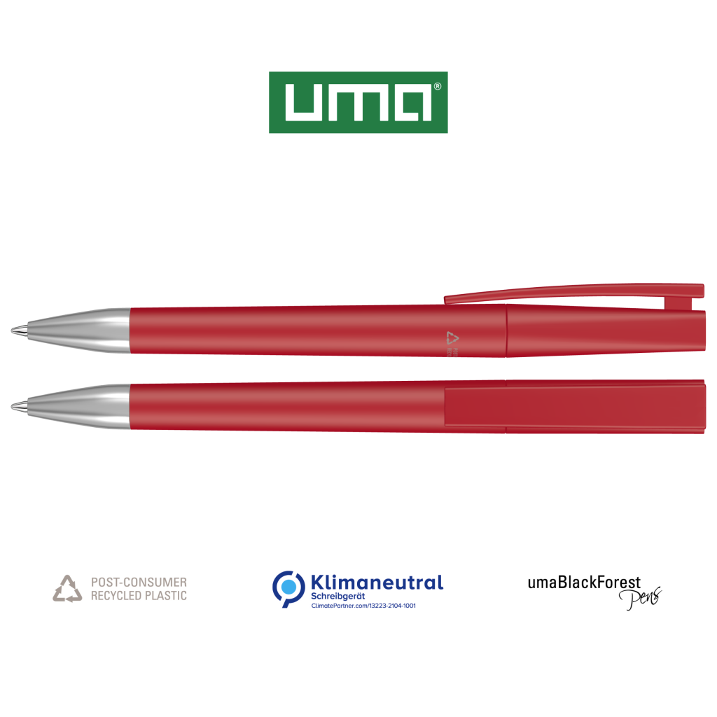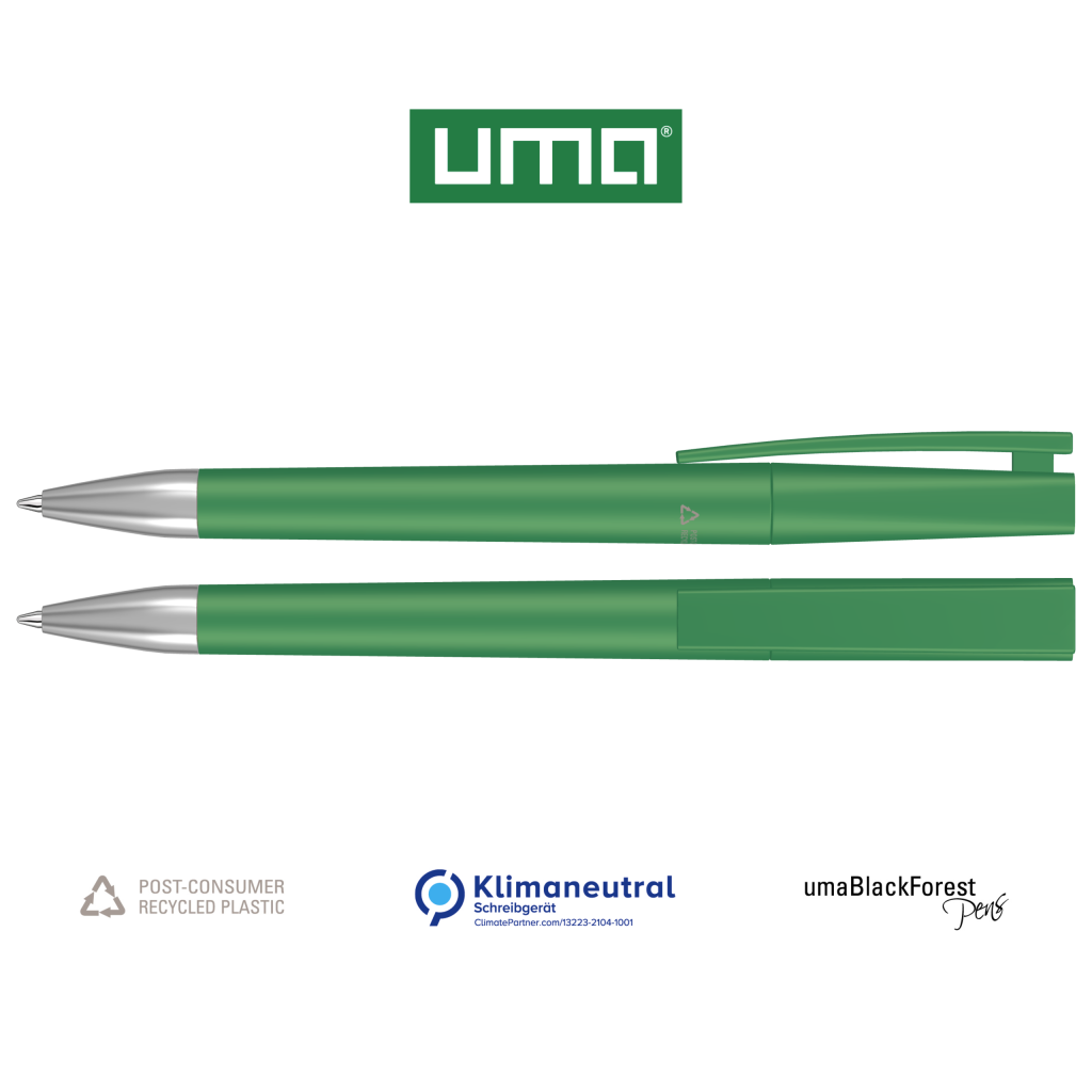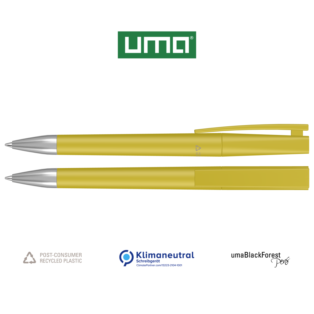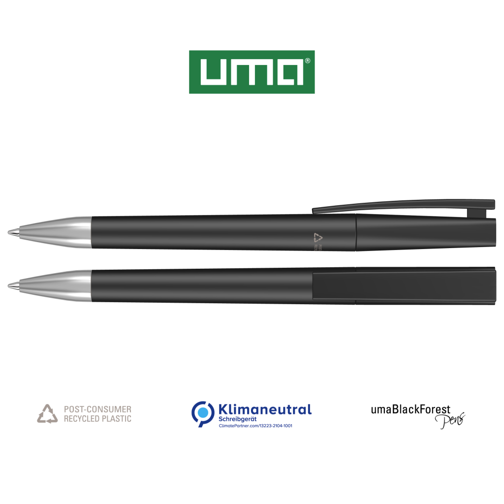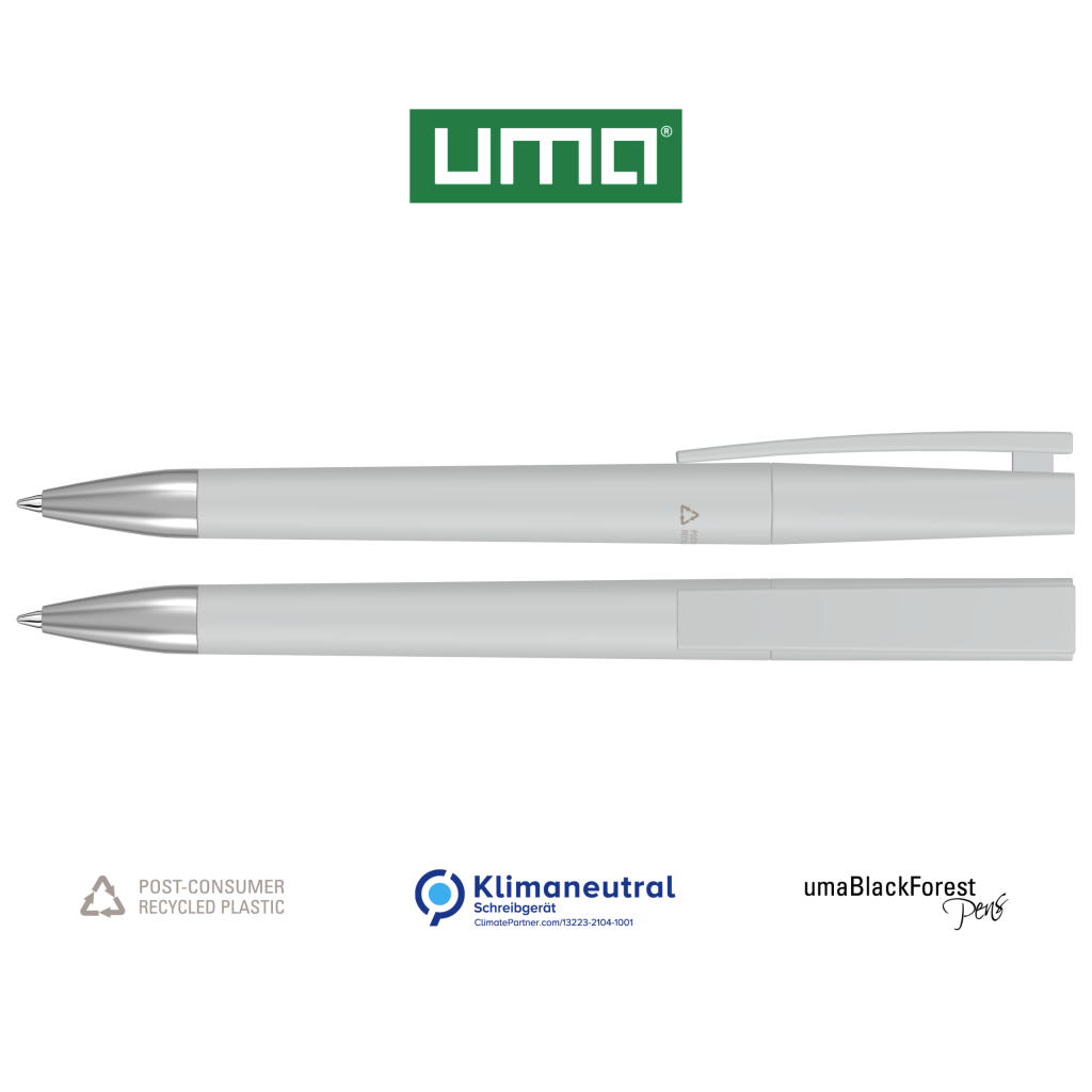 Twist ballpoint pen with opaque matt housing made from 100% recycled post-consumer plastic. Metal tip matt chromed.The model is labelled with the recycling mark. Plugs optionally available in various matt colours or silver (standard ABS). Thanks to the ClimatePartner-certified production, the uma ULTIMATE SI RECY makes an additional sustainable contribution to the protection of the environment. Due to the special nature of the material (post-consumer recycled plastic) production-related variations are possible.