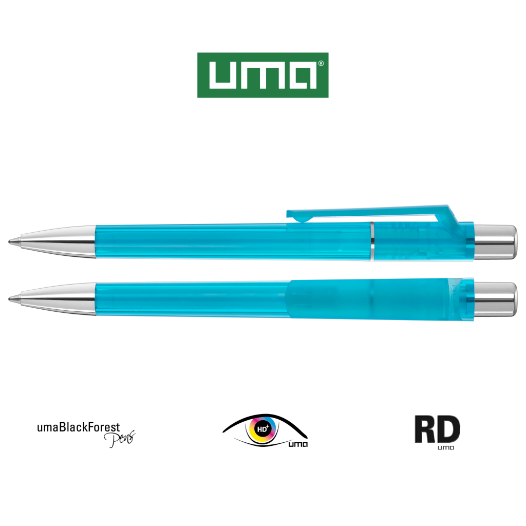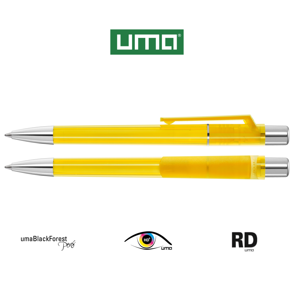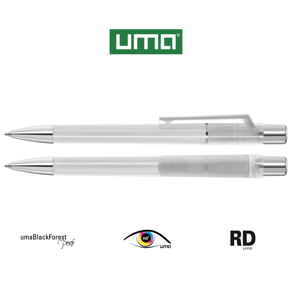Retractable ballpoint pen with transparent glossy housing, decorative metal ring, push-button and heavy metal tip chrome plated.