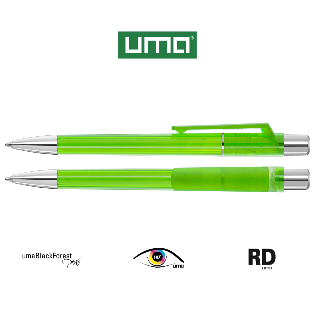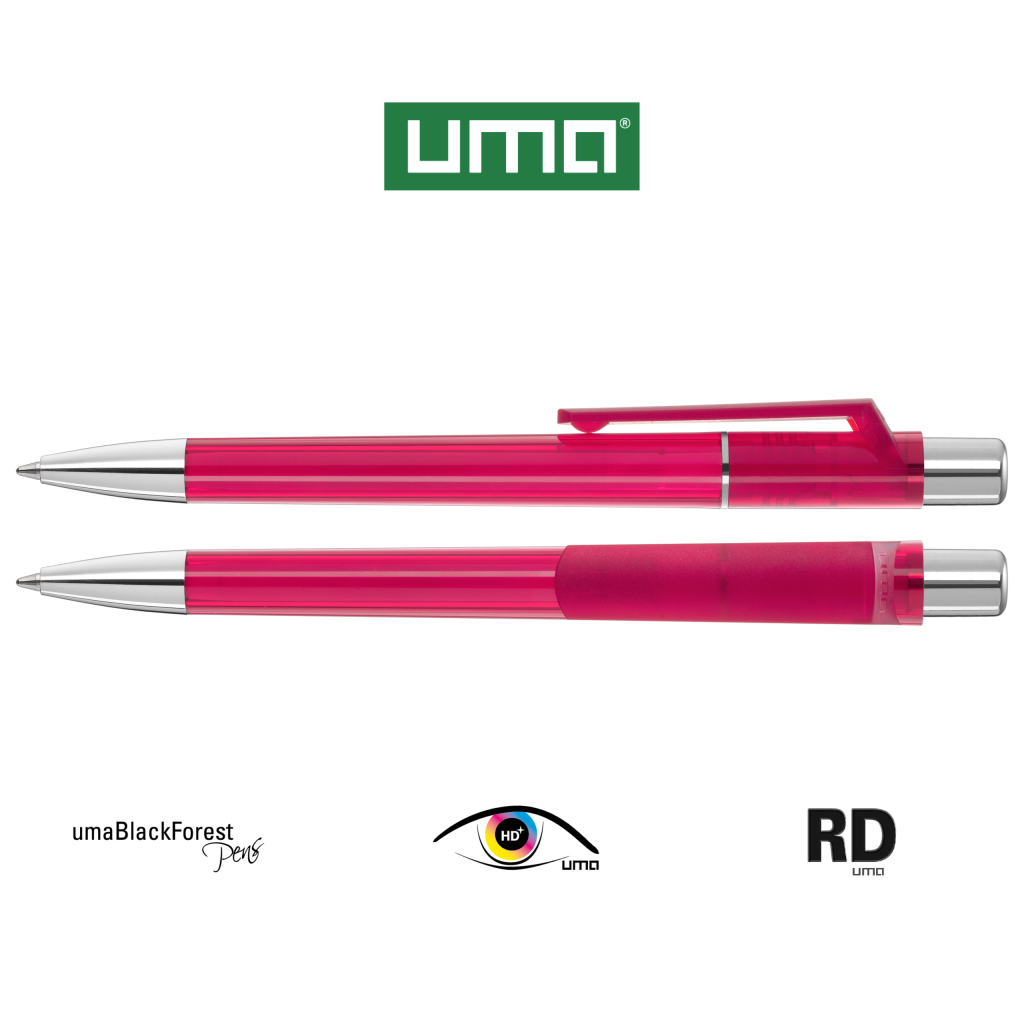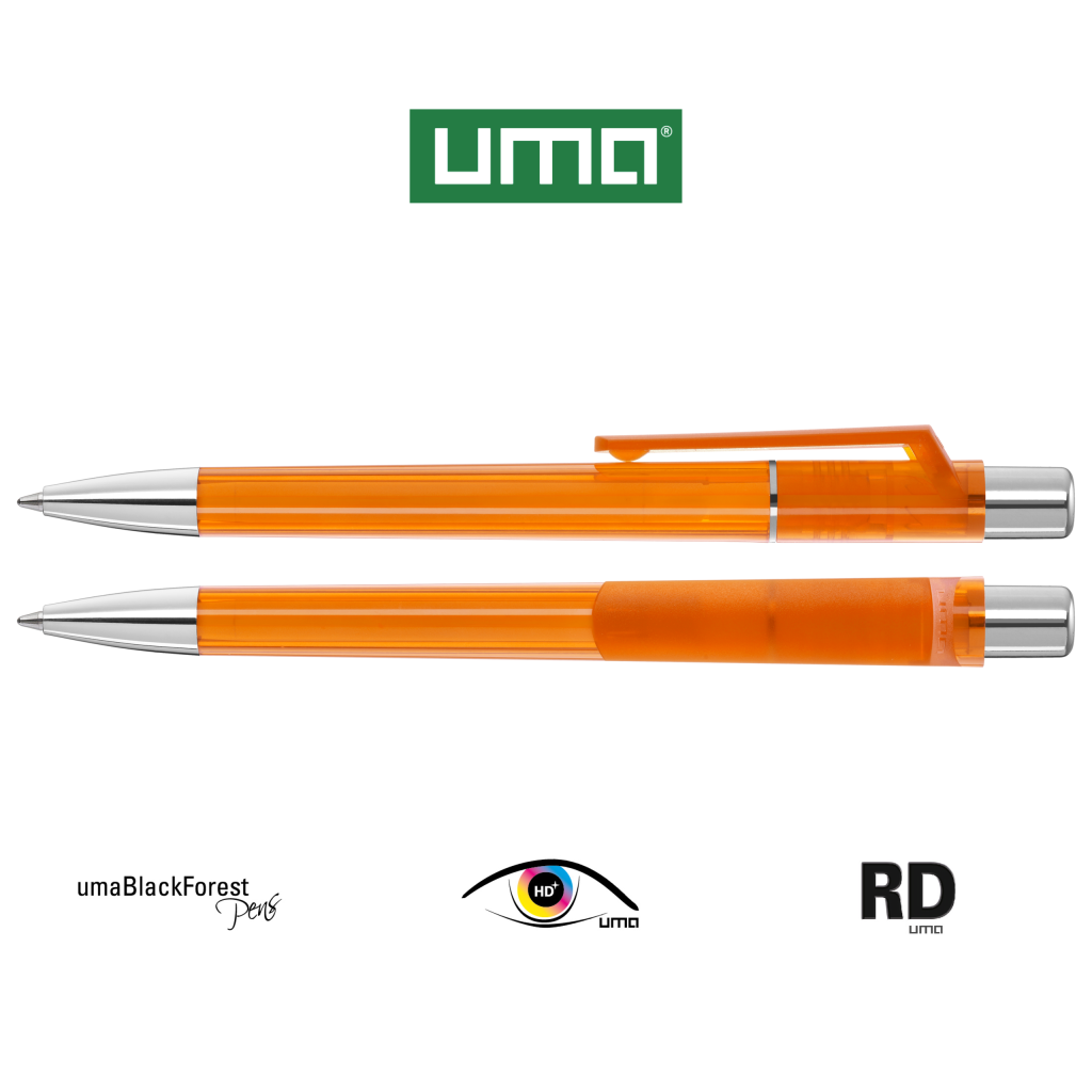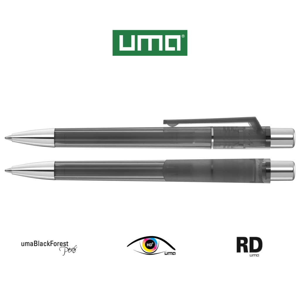 Retractable ballpoint pen with transparent glossy housing, decorative metal ring, push-button and heavy metal tip chrome plated.