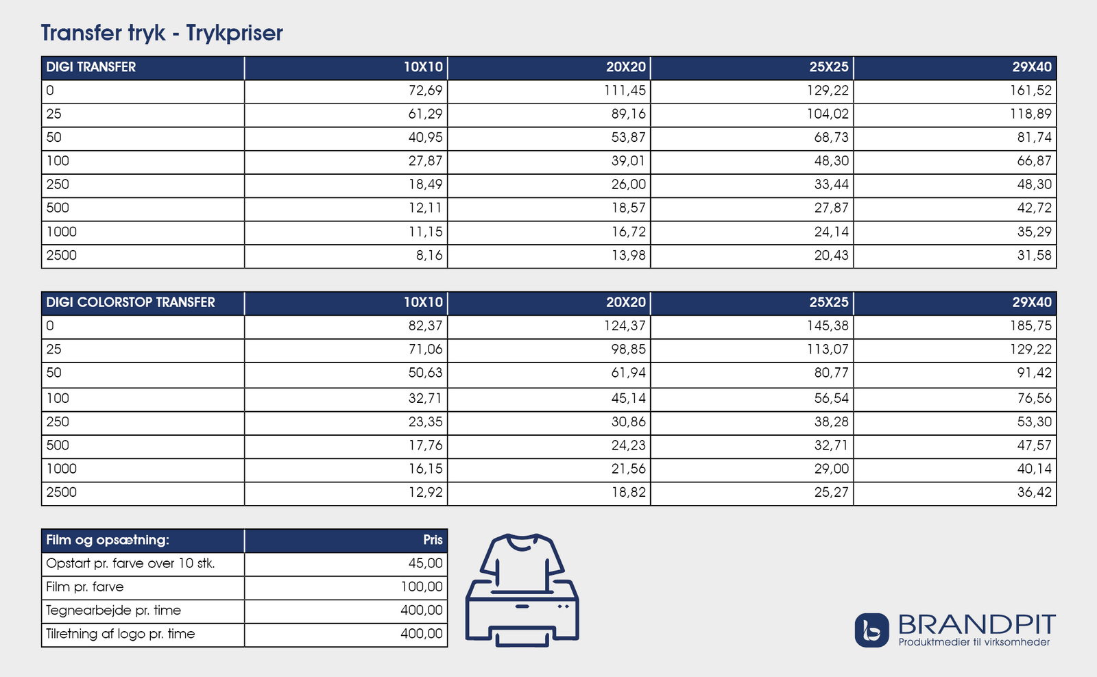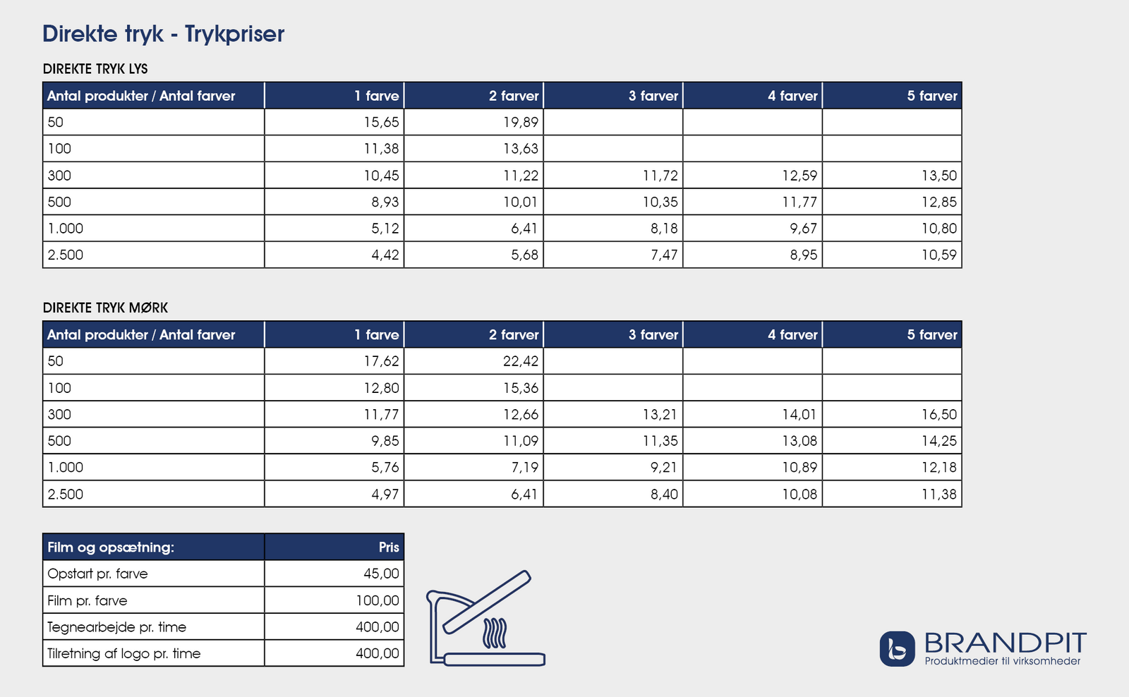 Direkte tryk, også kaldet rammetryk, repræsenterer enalsidig og effektiv trykketeknik, der skaber levende og høj kvalitet design på forskellige stoftyper. Med denne metode kan du fremstille præcise og skarpe motiver, der bevarer deres kvalitet og udseende gennem gentagne vaske.Direkte tryk har en markant fordel i forhold til omkostningseffektivitet ved større ordremængder. Denne teknik er derfor en ideel løsning for virksomheder og organisationer, der ønsker at producere markedsføringsmateriale eller brandvarer i betydelige mængder.Direkte tryk bør ofte være at foretrække ved tryk på t-shirts, sweatshirts, løbetrøjer og muleposer (tote bags). En direkte tryk-ordre skal være på mindst 50 stk.