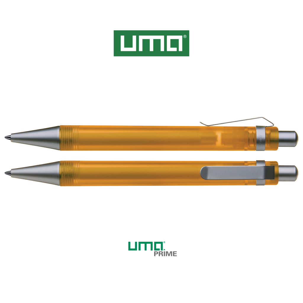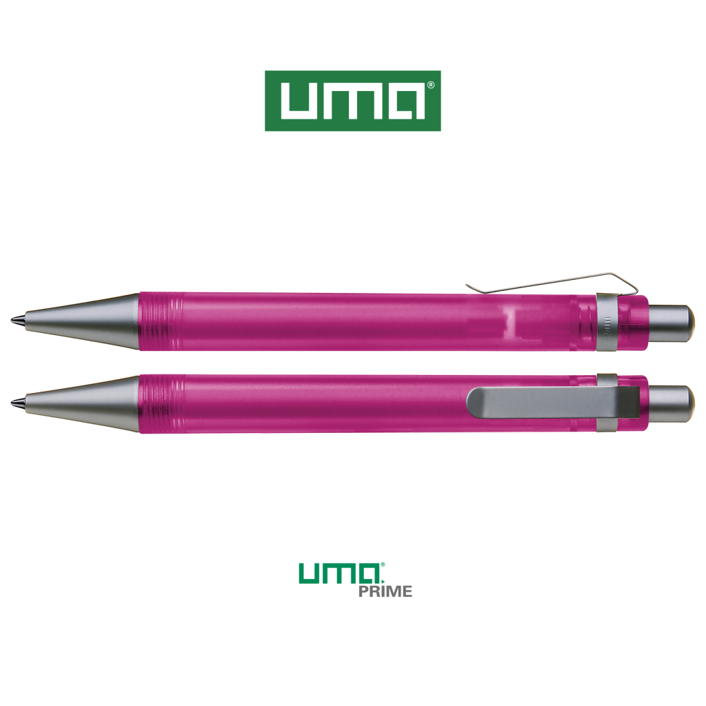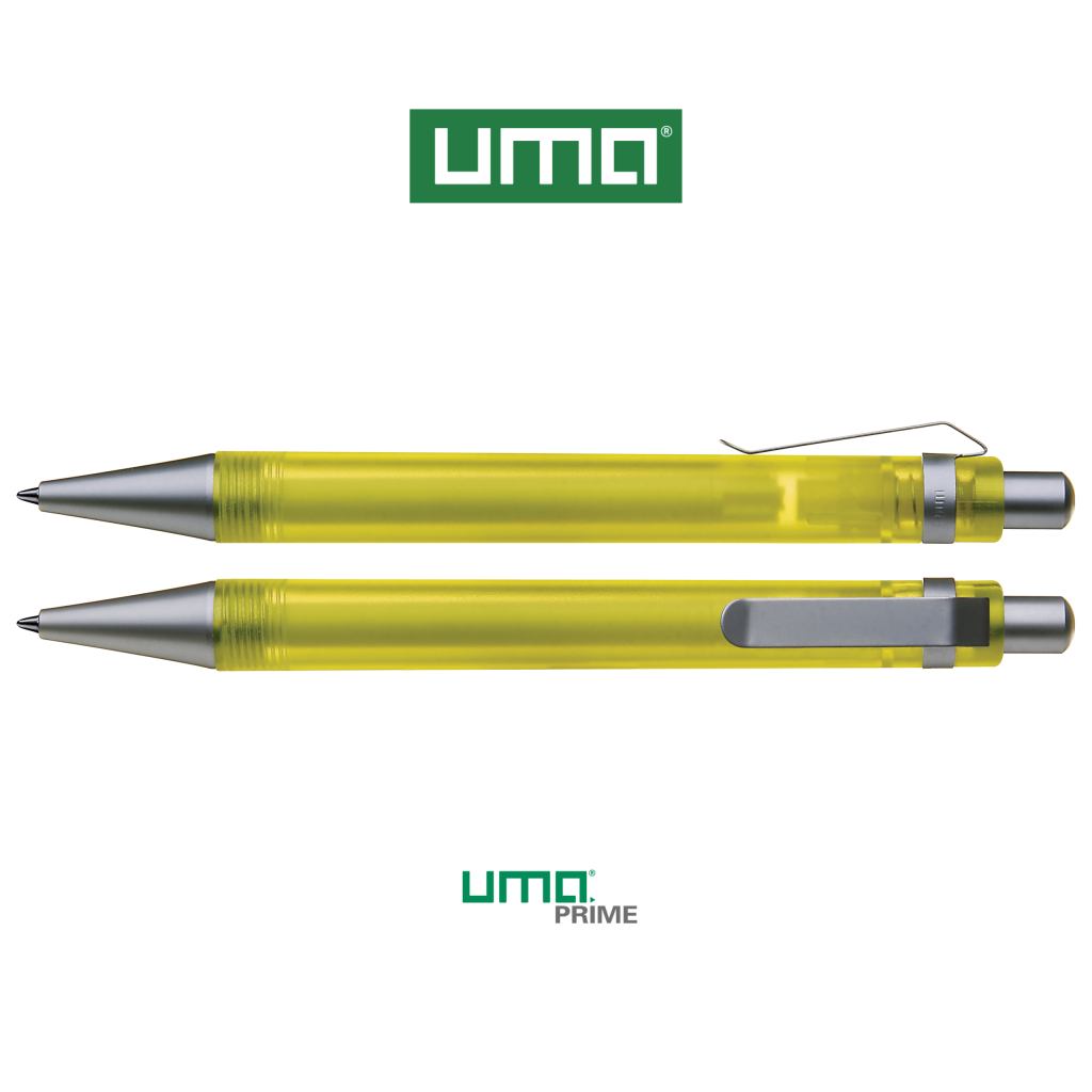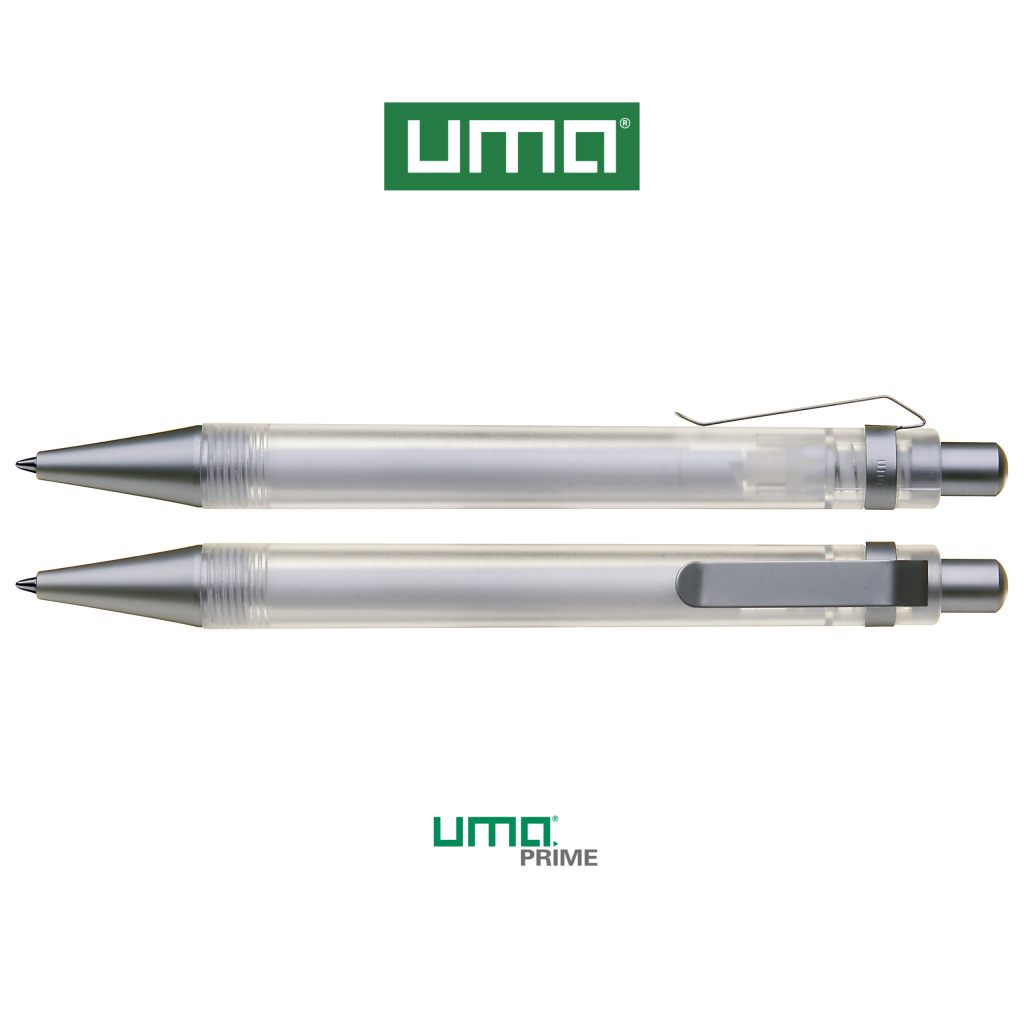 Retractable ballpoint pen with transparent frosted or opaque housing. Metal push-button, metal clip and metal tip matt chromed.