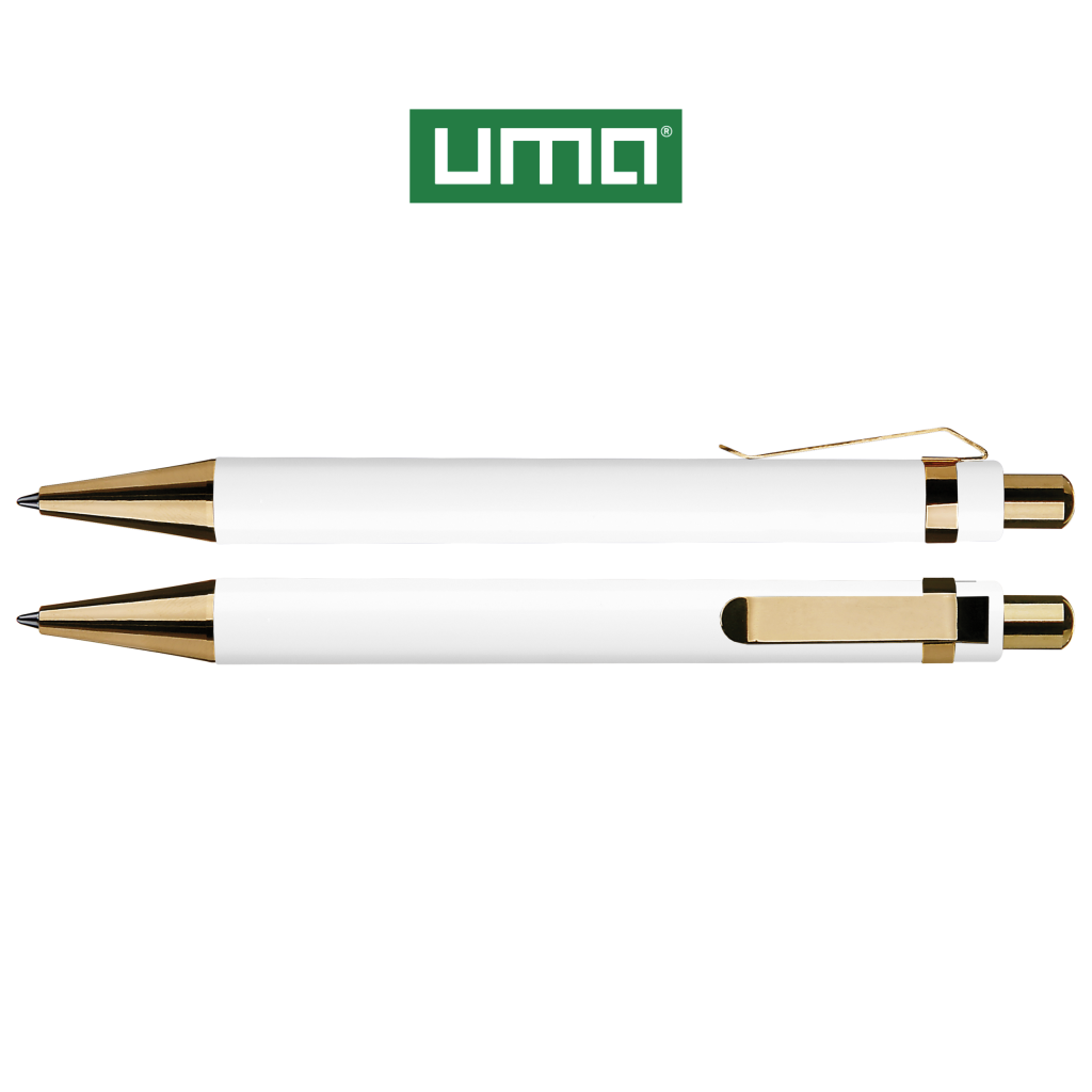 Retractable ballpoint pen with opaque housing in black or white. Metal push-button, metal clip and metal tip gold-plated.